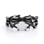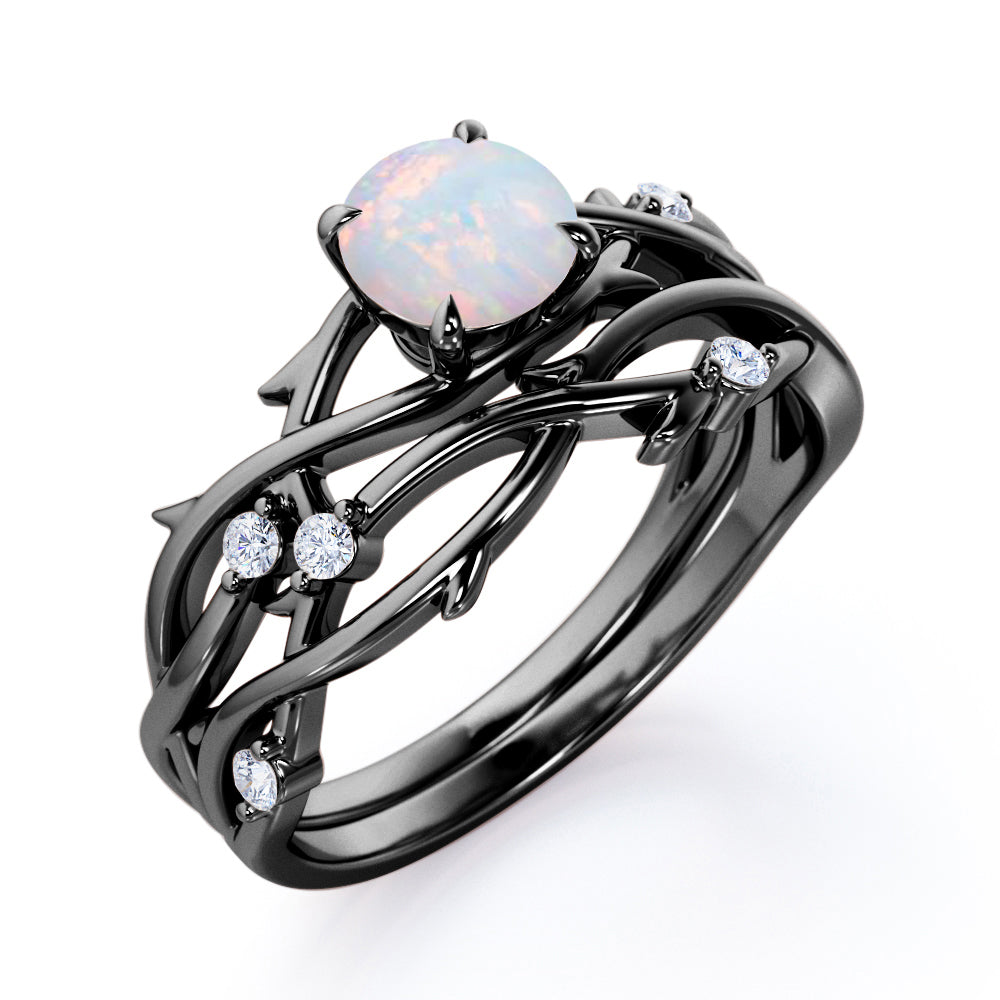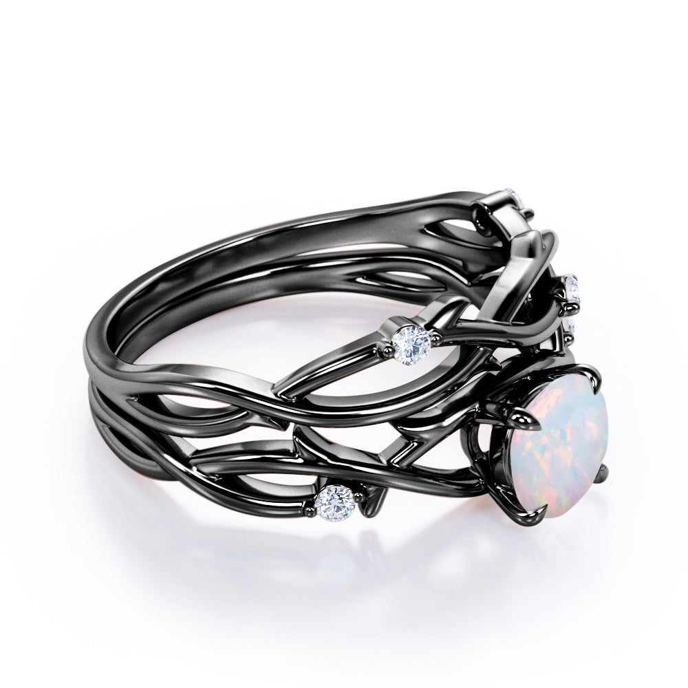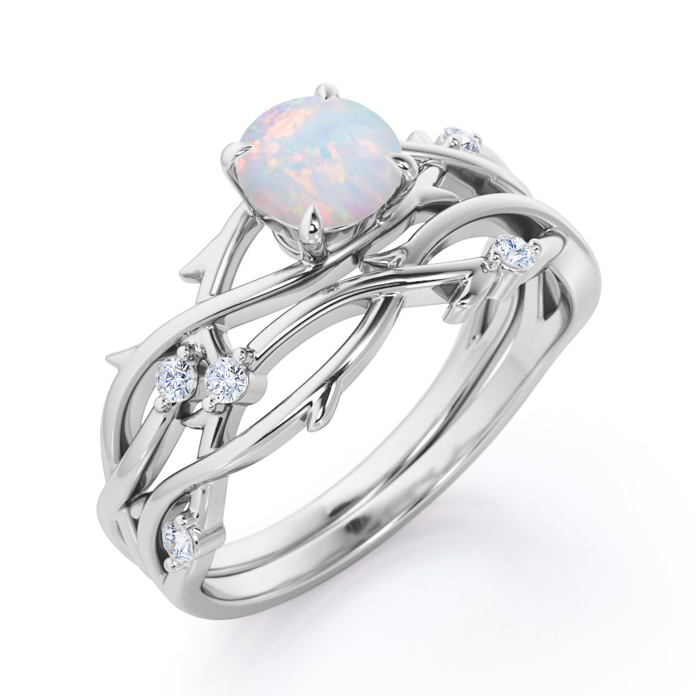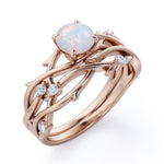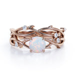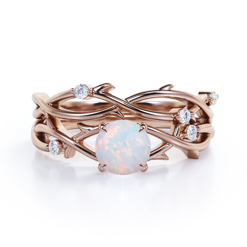 Twisted Leaf Twig 1.15 Carat Brilliant Round Cut Ethiopian Lab Created Opal And Diamond Infinity Style Bridal Set In Rose Gold. Delicate and feminine, this Lab Created Opal and diamond twisted leaf ring is certainly unique. An Lab Created Opal stone is set on a rose gold split-shank band with leaf twig detailing. The soft, cool-toned hues of the stone have an entrancing quality about them, emphasized by the rose gold crossover band. The combination stands out beautifully on a wide array of skin tones. This nature inspired bridal set features an engagement ring with 1 carat Lab Created Opal as the center stone and 0.15 carat of round dainty white diamonds including the matching infinity wedding band. Customizing your very own ring is the best way to get the look you love at a price point that works for you. As all our products are handmade by our experienced artisans, this twisted leaf twig 1.15 carat brilliant round cut Ethiopian Lab Created Opal and diamond infinity style bridal set in rose gold can also be customized to 18k Gold plating over silver, 10k Gold or 14k Gold as per your preference.