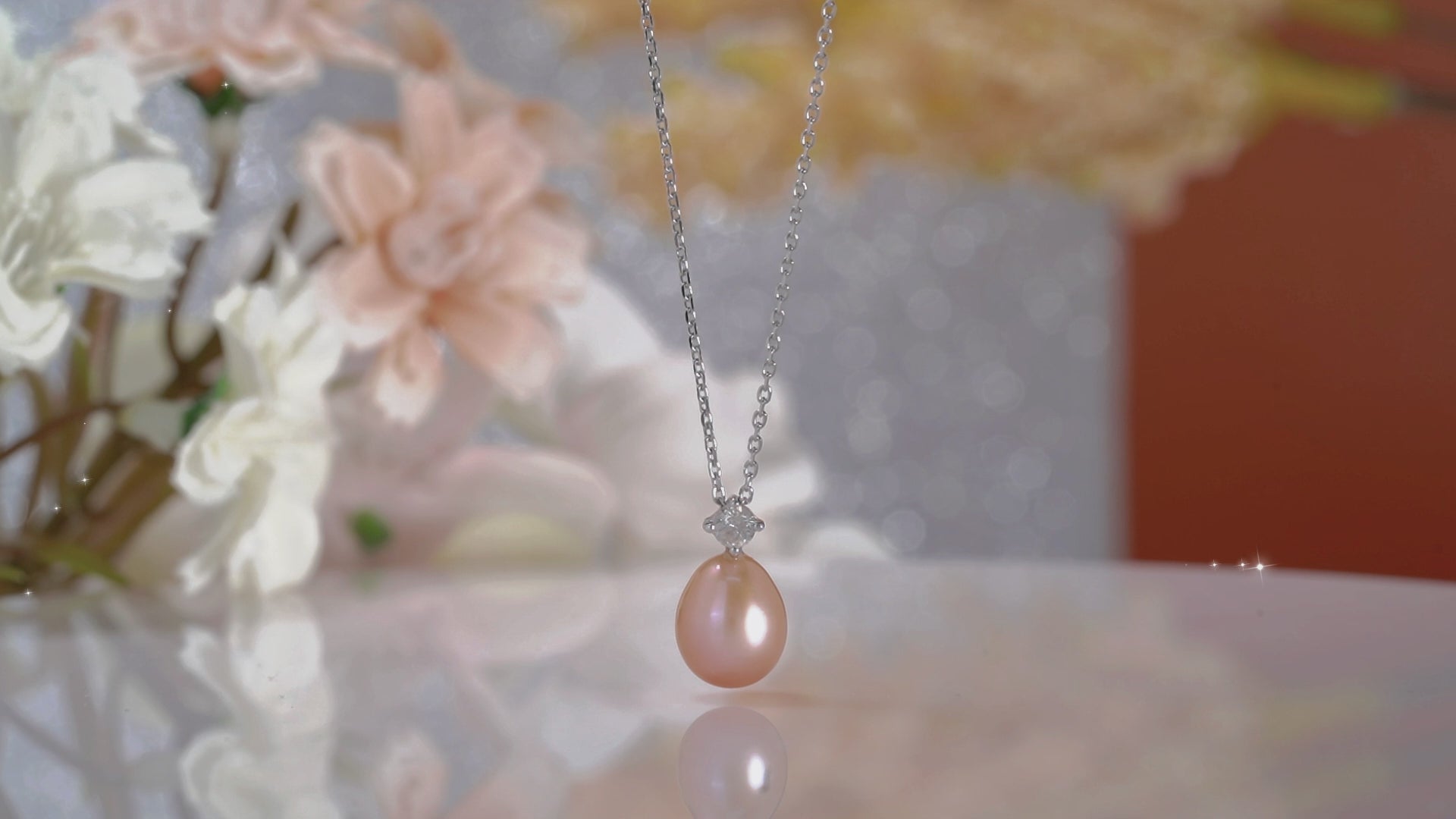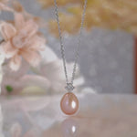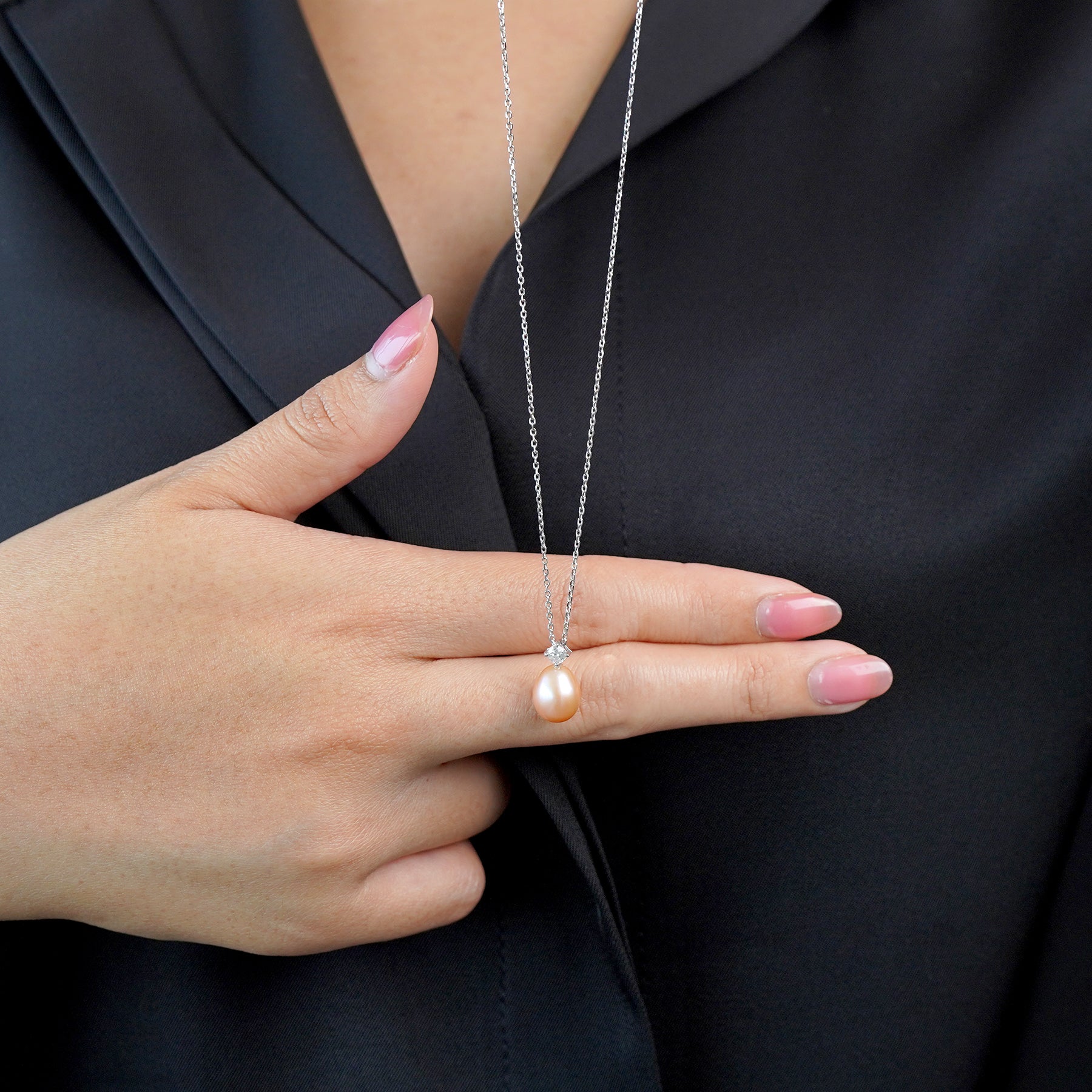 Gift your adored ones with our Delicate Pink Akoya Pearl and Round Cut Diamond with Prongs Pendant Necklace in 18K White Gold over Silver. Crafted professionally with care, our pearl necklace features an extraordinarily beautiful 8x10 MM pink Akoya pearl and a round-cut dazzling diamond with sturdy prongs to make sure the stones will stay intact. The freshwater pearl necklace features a round brilliant cut diamond and below the diamond hangs the classic and real Akoya pearl in 18K White Gold over Silver. Being correctly and expertly assembled together, the pearl and diamond necklace is sure to be everyone's favorite piece of jewelry of all time. Because of the shine and luster of this real akoya pearl, this classic stone has always been a beloved jewel in every wardrobe. This single pearl silver necklace is a true elegance at an affordable price. In addition, this mother of pearl necklace are suitable for every occasion for example, as gifts on Valentine's Day, Mother's Day, Birthday, Anniversary, or simply an addition to your precious collection. Cherish your beloved ones with this Delicate Pink Akoya Pearl and Round Cut Diamond with Prongs Pendant Necklace in 18K White Gold over Silver