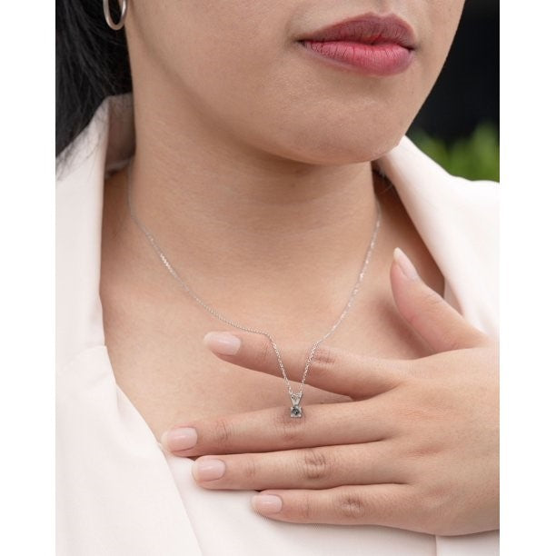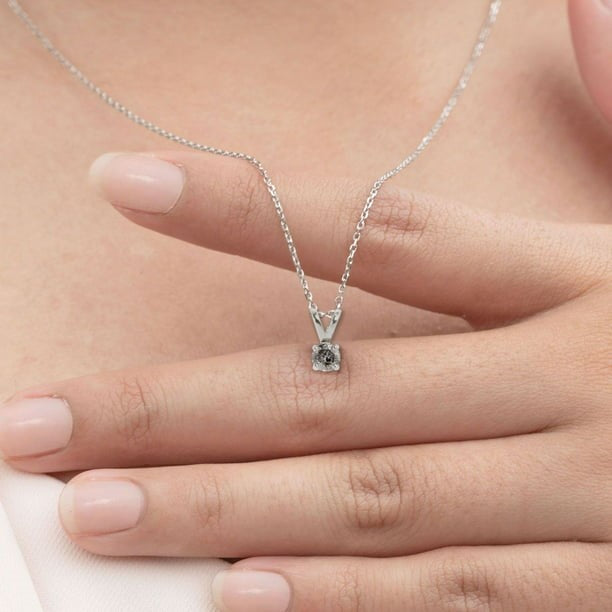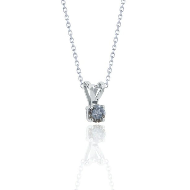 Take a look at this Elegant Round Brilliant Cut Salt and Pepper Diamond Solitaire Pendant Necklace in 18K White Gold Plating over Silver. Made with love and care from our talented designers and jewelers, this diamond chain for women integrates 0.25-carat salt and pepper diamond in 18K gold over silver. The color of this diamond necklace for women comes in white. With a unique and authentic salt and pepper diamond, this is the perfect diamond necklace for women. This real diamond pendant will get you endless compliments. This diamond pendant with chain is an incomparable and affordable beauty. Furthermore, this diamond chain for women can serve as a gift on many special occasions like mother's day, birthdays, anniversaries, and Valentine's Day, or simply a great addition to your jewelry collection. Make them feel special with this real diamond pendant necklace and you will never regret it.