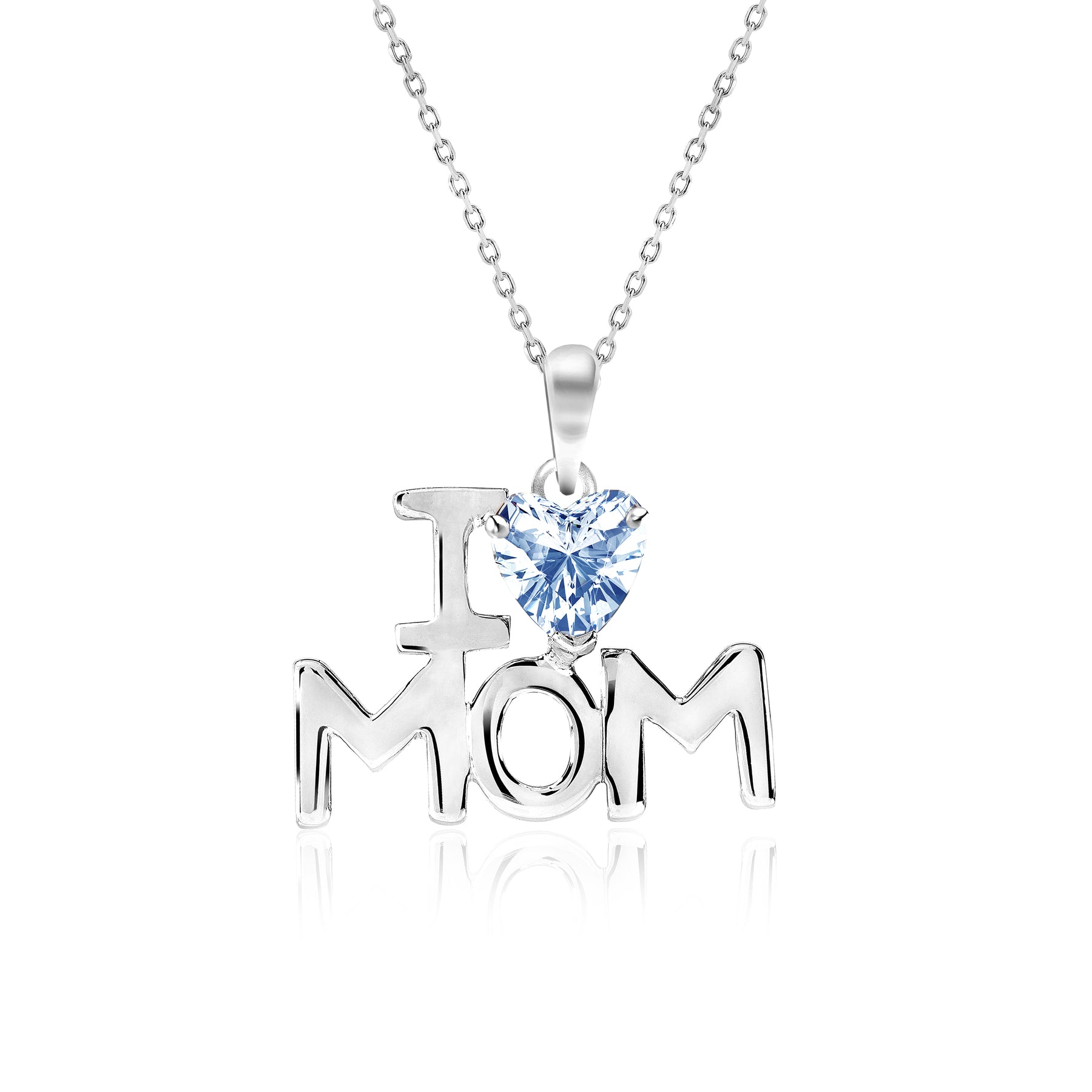 I Love Mom Heart Shaped Ice Blue Stone Pendant Necklace with 18K White Gold over Silver - March Birthstone - Mother's Day Jewelry Gift