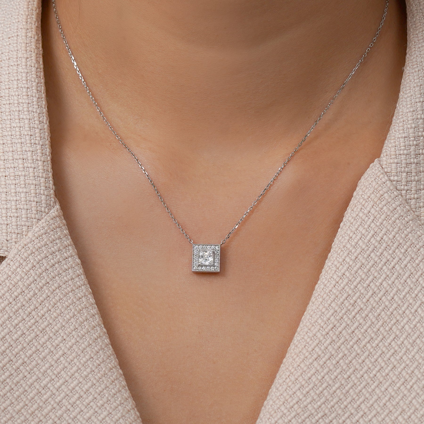 This exquisite 1 Carat Art Deco-Inspired Princess Cut Moissanite Pendant - in 18K White Gold Plating Necklace for Women features a timeless art deco-inspired design, highlighted by a brilliant 0.75 carat princess cut moissanite at its center. Framed by a dazzling set of side stones totaling 0.25 carat, the pendant radiates elegance and sophistication. The square setting, adorned with intricate detailing and fine pave work, adds a touch of antique charm, while the openwork gallery enhances light reflection for maximum sparkle. Crafted in high-polish white metal and secured by a durable chain, this 1 carat total weight piece is a perfect example of necklaces for woman, ideal for both everyday elegance and special occasions. Whether given as a gift or worn as a statement of personal style, this moissanite pendant offers luxurious brilliance with a sustainable touch.