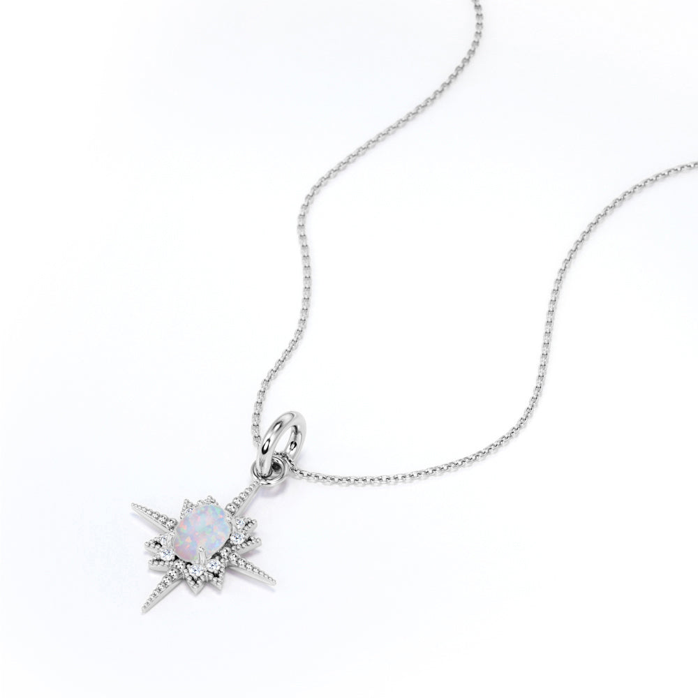 Beaded Star Halo 1.10 Carat Oval Cut Genuine Opal And Diamond Four Prong Pendant Necklace In White Gold. If you’re looking to spend less, this natural opal and diamond necklace is a great option. A striking oval cut opal stone is surrounded by small round diamonds in a unique star-like halo setting. The four prong holds the center opal stone of 1 carat which radiate colorful jewel tones. The necklace features an asymmetric sparkling star pendant with beaded edges. Inspired by the glittering stars, this star themed necklace is perfect for anyone who wants to add the magic of the night sky to their look. Since all our products are handmade by our well-experienced artisans, this beaded star halo 1.10 carat oval cut genuine opal and diamond four prong pendant necklace in white gold can also be customized to 18k Gold plating over silver, 10k Gold or 14k Gold as per your preference.