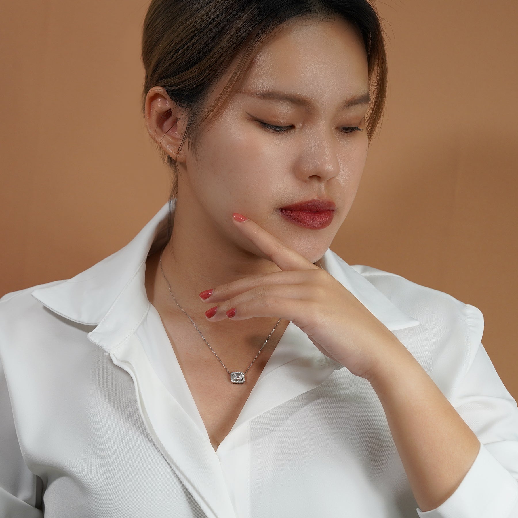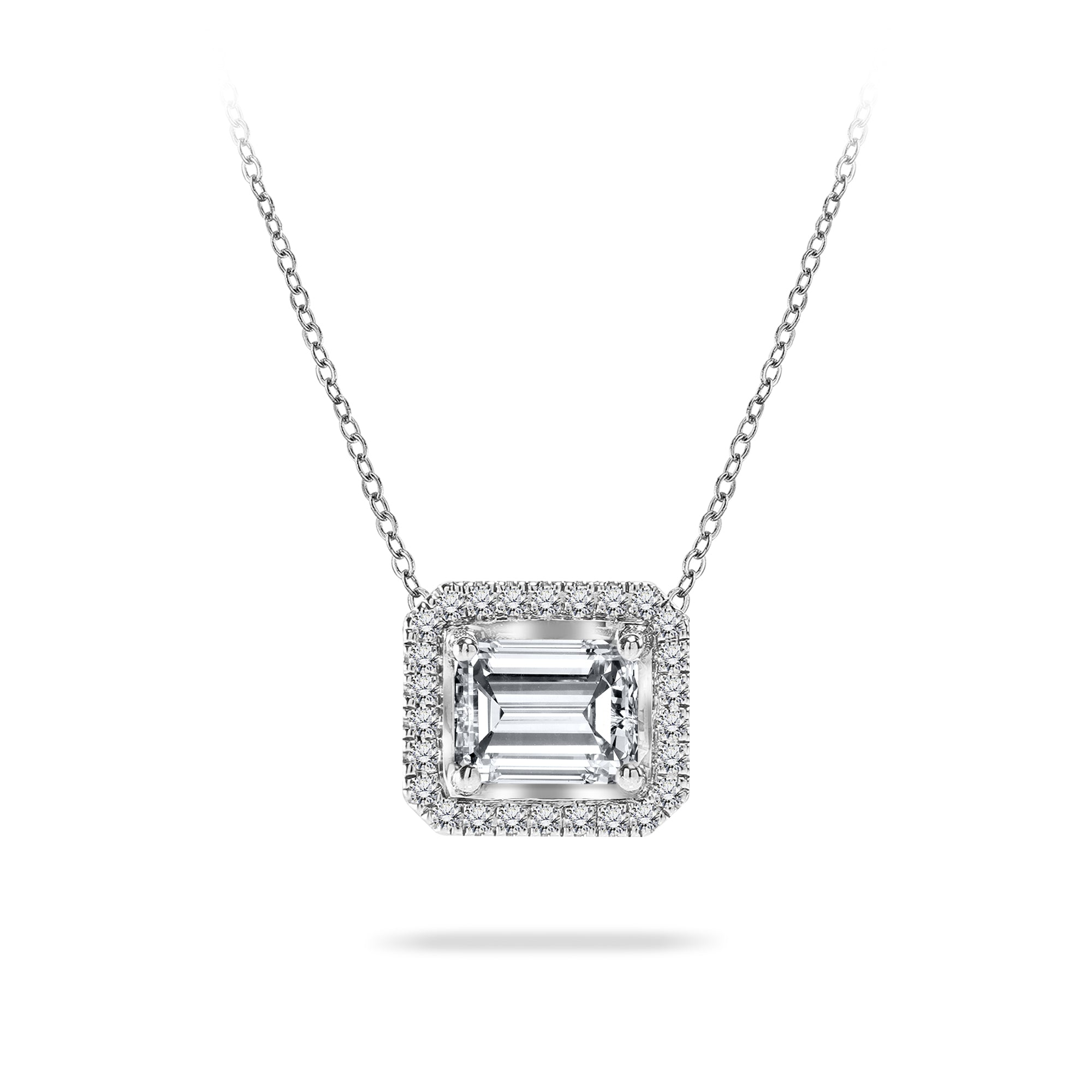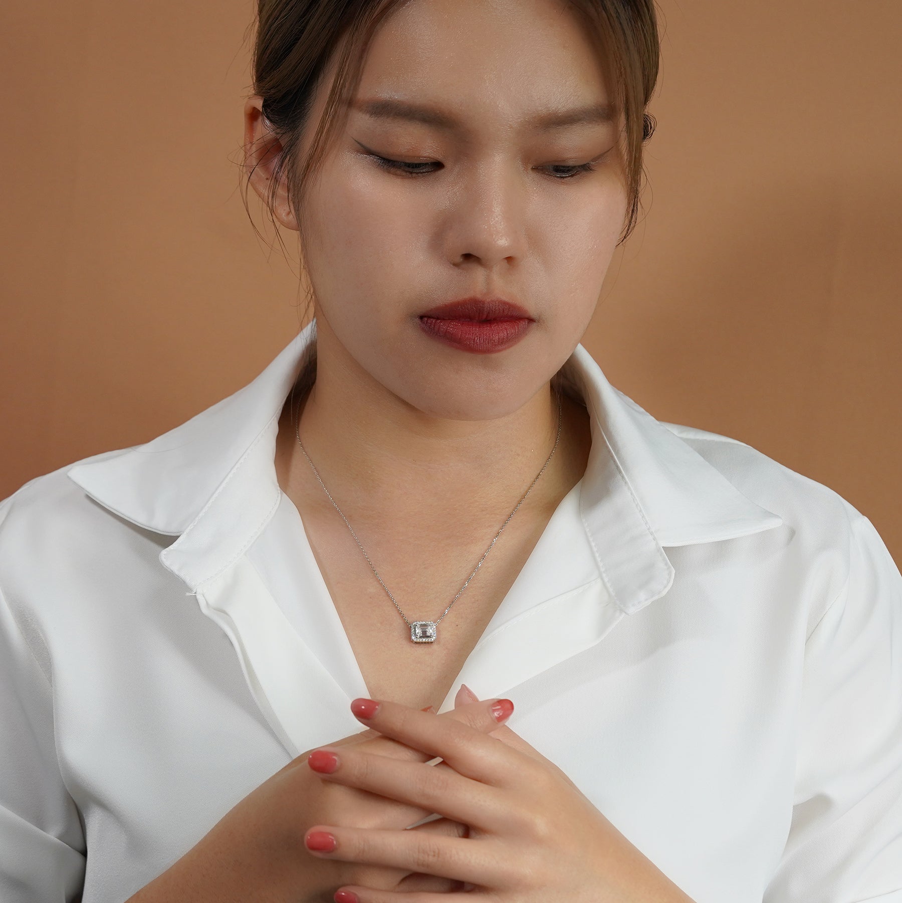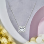 Capture all attention with our Distinctive 1 carat Emerald Shaped Moissanite - Halo Sideways Emerald - Pendant Necklace in 18K White Gold over Silver. This 1 carat emerald halo pendant is designed for those who appreciate the timeless allure of emeralds paired with a touch of contemporary flair. At its heart, this east west pendant necklace features a striking 1 carat emerald-shaped moissanite, lovingly embraced by a breathtaking halo of shimmering stones. Placed in a horizontal orientation, this minimalist emerald necklace pendant brings out a new style while maintaining the essence of a classic pendant necklace. This emerald with halo pendant elevates the charm of the central stone, creating an awe-inspiring focal point that captures light from every angle, making the solitaire pendant necklace dazzles beautifully. The marriage of classic and contemporary design elements in this slide pendant makes it a distinctive and versatile addition to your jewelry collection.