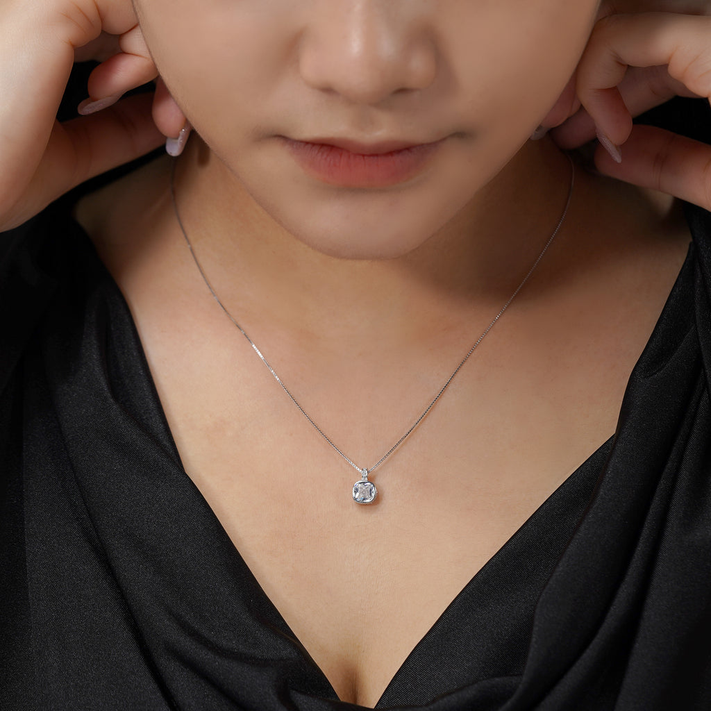 Minimalist 1.8 Carat Cushion Cut Bezel Pendant Necklace in Sterling Silver - Solitaire Pendant. This elegantly crafted necklace highlights a stunning 1.8 carat cushion-cut stone encased in a sleek bezel setting, providing a modern twist on the classic solitaire pendant. Made from high-quality sterling silver, this piece is designed for both durability and shine, making it an ideal choice for everyday wear or special occasions. The bezel setting not only secures the stone but also enhances its brilliance, allowing light to enter and reflect in a spectacular display. The simple yet sophisticated design makes this necklace a versatile addition to any jewelry collection, easily pairing with both professional attire and evening wear. Its understated elegance ensures that it remains a timeless accessory, perfect for those who appreciate minimalism with a touch of luxury. The necklace comes with a robust sterling silver chain that complements the pendant's refined aesthetic, ensuring that it lays beautifully and catches the eye. Whether as a gift or a personal treat, this solitaire pendant necklace is sure to impress with its classic beauty and modern appeal. Metal Type: Sterling Silver|Necklace Design Type: Pendant|Jewelry Style: Modern, Fashion, Unique|Suitable as everyday wear, gift-giving, addition to jewelry collection, etc.|Highly Affordable|100% Satisfaction Guaranteed. Each order comes with 30 days Refund policy.|Manufacturer: JeenMata|Condition: New