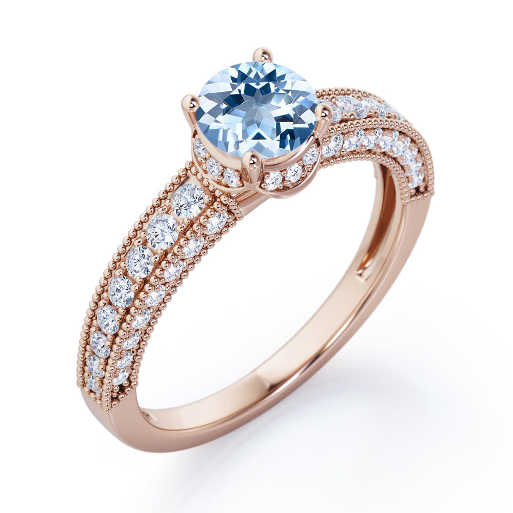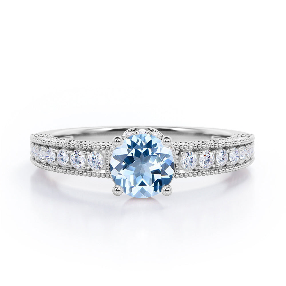 Classic Four Prong 1.45 Carat Round Cut Aquamarine And Diamond Vintage Milgrain Engagement Ring In White Gold. If you are an outside-the-box kind of person, then our exquisite aquamarine and diamond engagement ring is a great choice. Set in classic four prong setting, this brilliant round cut aquamarine stone radiates deep jewel tones. This alluring ring is perfect for vintage lovers with an art deco milgrain edging all around the band. This vintage inspired engagement ring features 1 carat aquamarine as the center stone and 0.45 carat of sparkling white diamonds. Handmade with utmost love and detailed attention, this aquamarine and diamond engagement ring is certainly a bold choice that will stand out. This classic four prong 1.45 carat round cut aquamarine and diamond vintage milgrain engagement ring in white gold can also be customized to 18k Gold plating over silver, 10k Gold, 14k Gold as per your preference. Please note that if the ring is made over silver, the side stone will be moissanite and if it is made on gold, diamond will be employed as the side stone.
