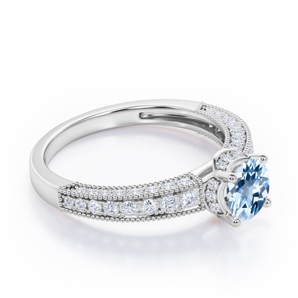 Classic Four Prong 1.45 Carat Round Cut Aquamarine And Diamond Vintage Milgrain Engagement Ring In White Gold