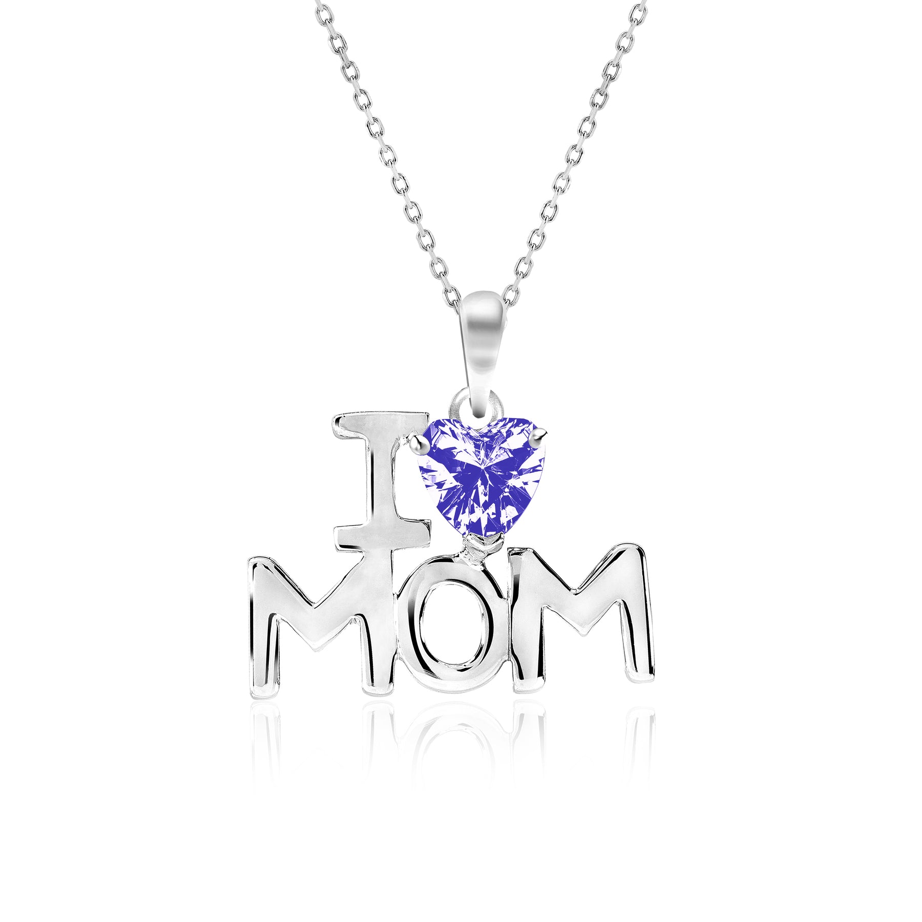 I Love Mom Heart Shaped Multi-Color Purple Stone Pendant Necklace with 18K White Gold over Silver - June Birthstone - Mother's Day Jewelry Gift