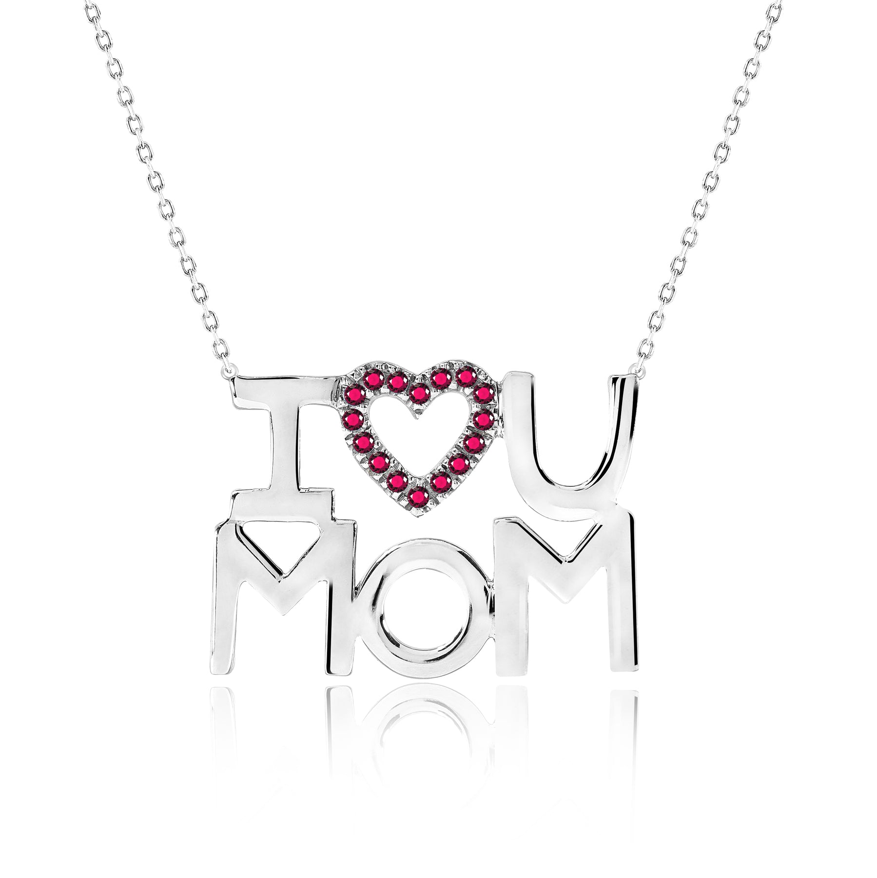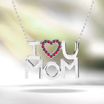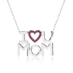 I Love U Mom Red Stone Embellished Open Heart Pendant Necklace in 18K White Gold over Silver - January Birthstone - Gift for Mom