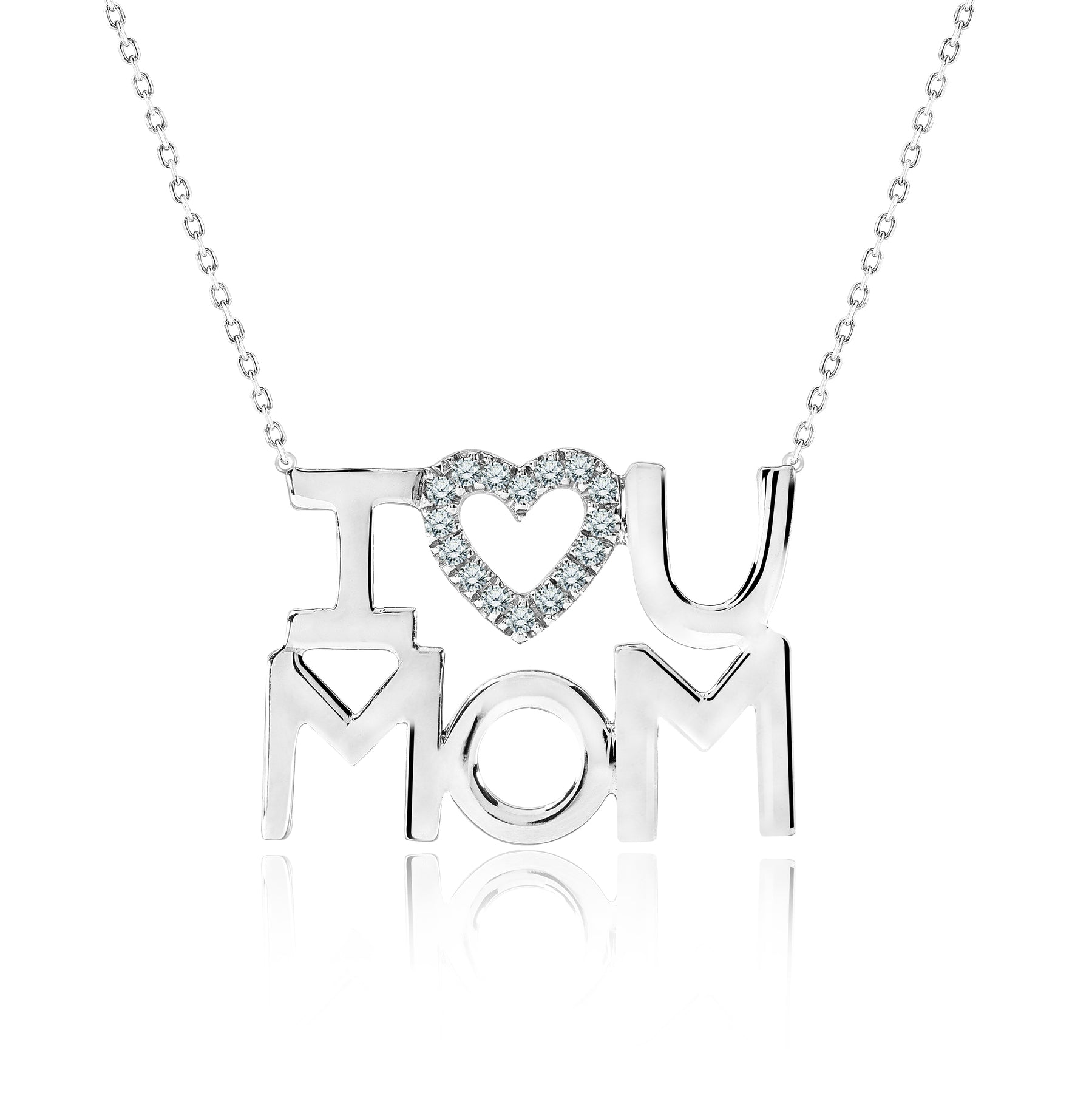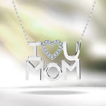 I Love U Mom White Stone Embellished Open Heart Pendant Necklace in 18K White Gold over Silver - April Birthstone - Gift for Mom