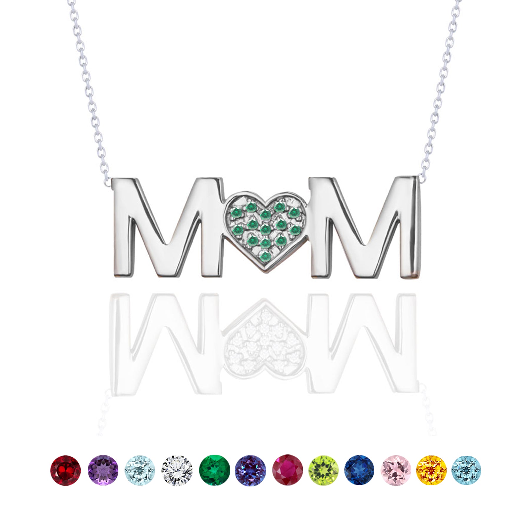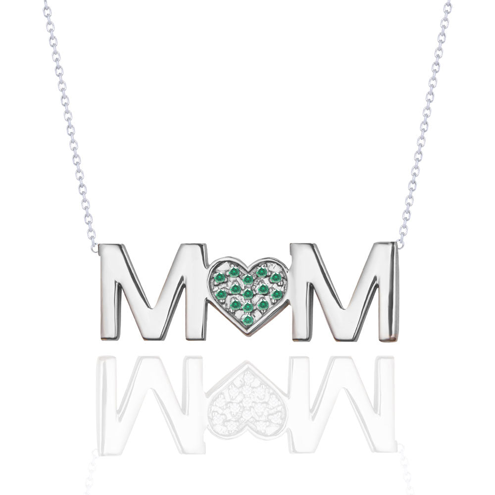 MOM Pendant Necklace - Dark Green Stone - May Birthstone in 18K White Gold over Sterling Silver