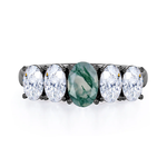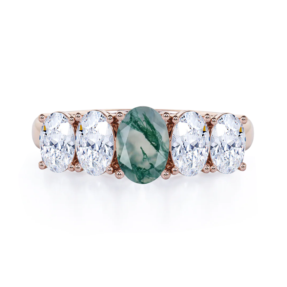 Make your special day more memorable with the sparkling Oval Basket Set 1.25 carat Moss Green Agate and Moissanite Fine Jewelry Ring in Rose Gold. This promise ring can be an engagement ring or a luxurious gift for your special someone. The ring boasts a 0.4 carat Oval Moss Green Agate in the center with four oval Moissanite stones in different sizes. The ring can glisten the look either you are attending the glam party or going out to shopping.