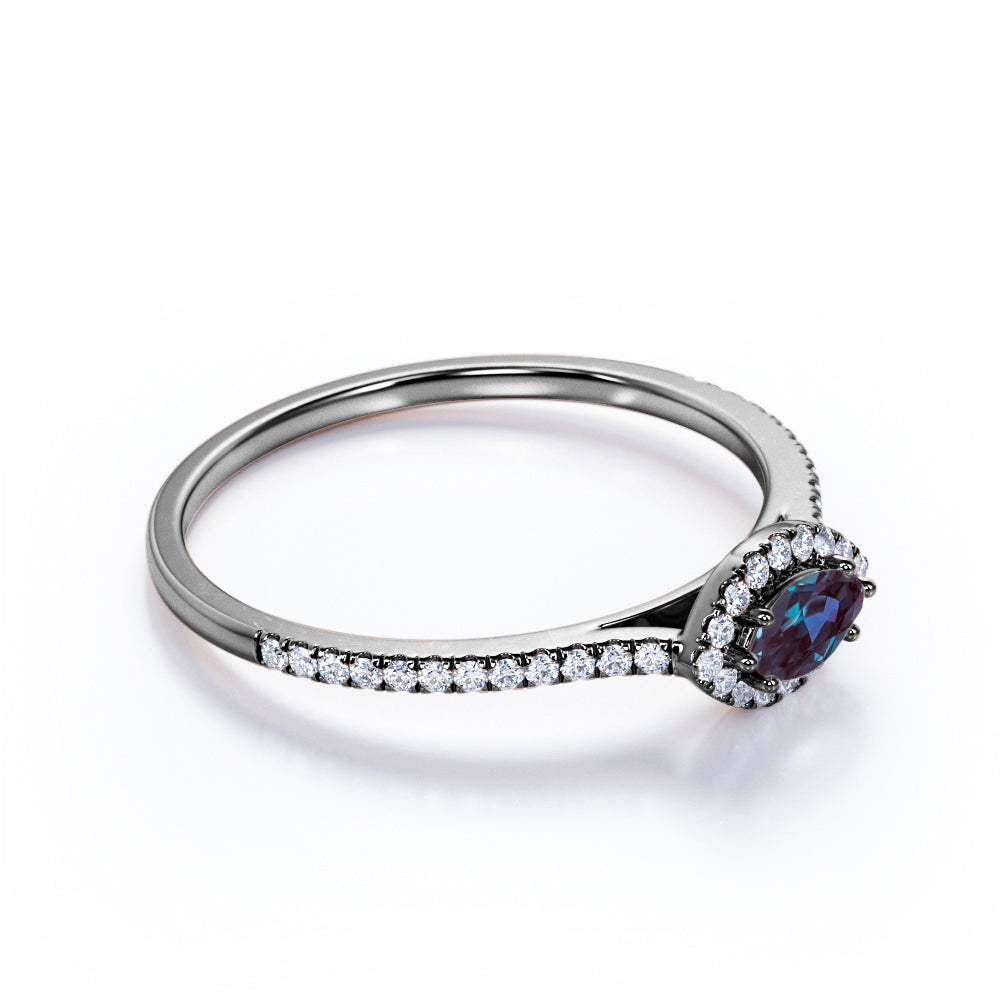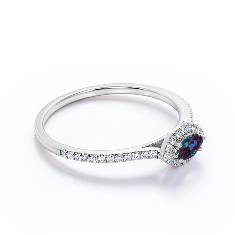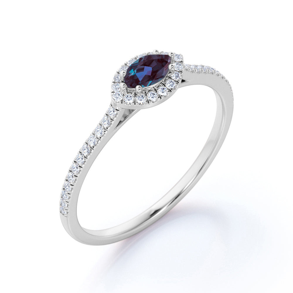 East West Setting 1.35 Carat Marquise Cut Lab Created Alexandrite And Diamond Halo Engagement Ring In White Gold