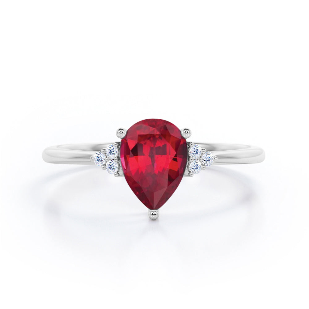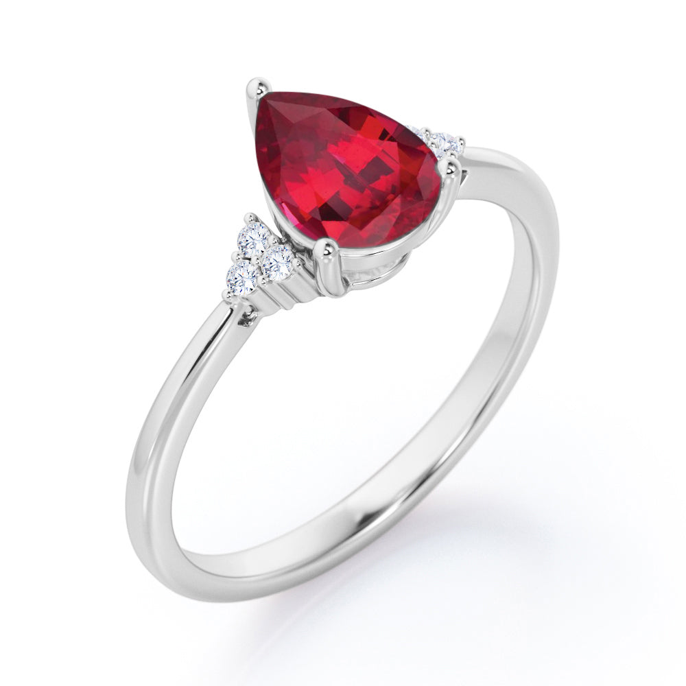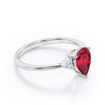 Seven Stone 0.5 carat Pear Lab-Created Ruby and Diamond Dainty Band Engagement Ring in White Gold displays a 0.5 carat Pear Lab-Created Ruby in the center and flanked by clustered triangle that is formed with three dainty round diamonds on each side. Some people believe that 7 is a good number that will bring you good luck. Wish your believed one well with this Ruby and diamond engagement ring that can also become there everyday wear jewelry. The promise ring can be customized to your choice of 18k gold over silver, 10k gold and 14k gold with the color of white gold, rose gold, yellow gold and black gold.