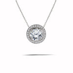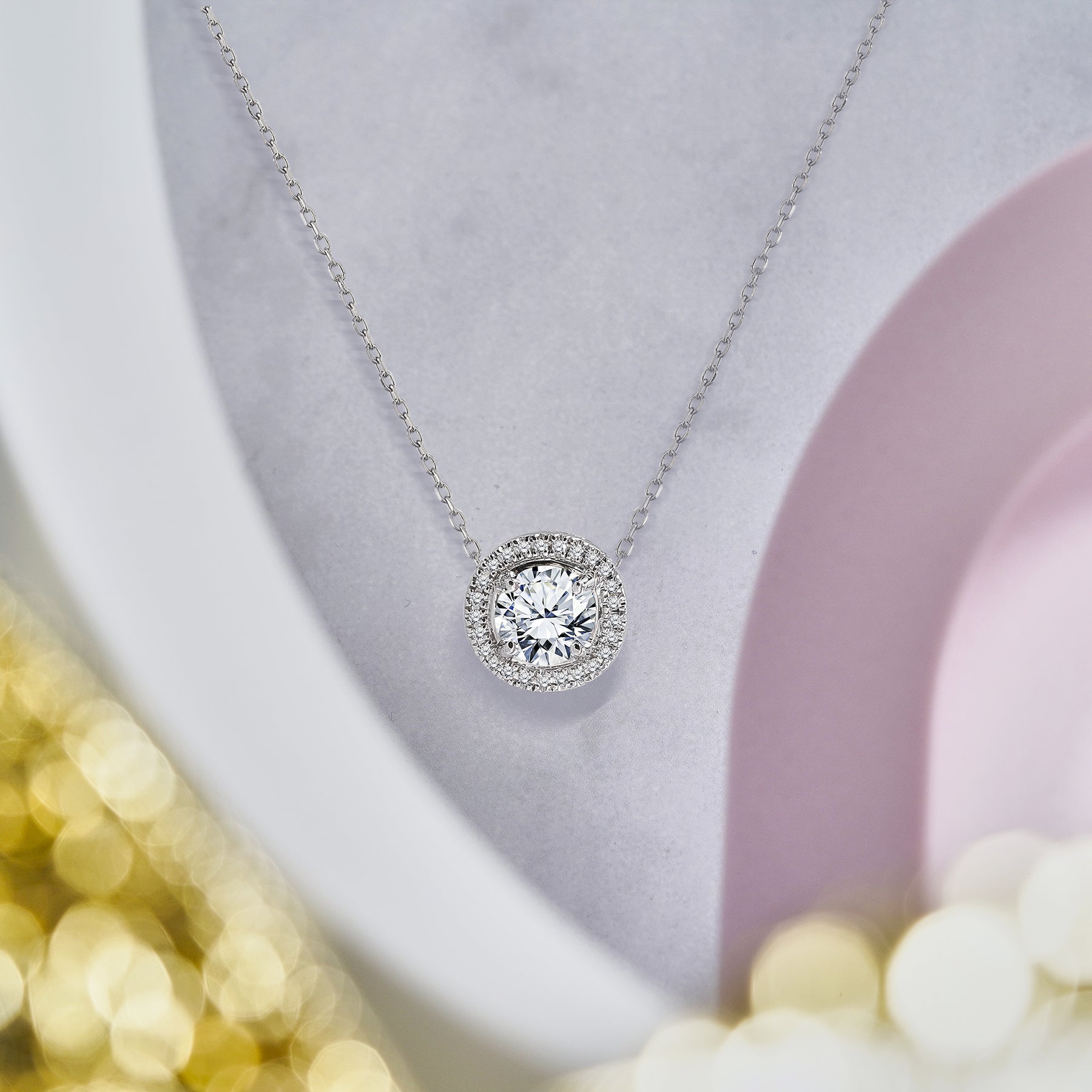 Elevate your elegance with our 1 Carat Floating Halo Round Cut Moissanite Slider Pendant Necklace for Women in 18K White Gold over Silver. This moissanite pendant necklace seamlessly marries affordability and uniqueness, creating a captivating addition to any jewelry collection. This dainty moissanite necklace pendant features a brilliant 1 carat round cut moissanite gemstone delicately nestled within a mesmerizing floating halo design. The shimmering beauty of the moissanite jewelry pendant is showcased in a simple yet sophisticated halo sliding pendant design, making it an ideal choice for those who appreciate the subtlety of a single pendant necklace. The round halo necklace gracefully slides along a sterling silver chain, offering you the flexibility to adjust its length to your preference. Crafted with precision and care, this silver slide necklace will easily become your favorite piece.