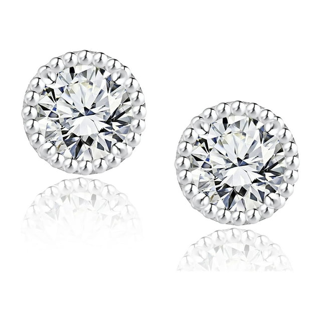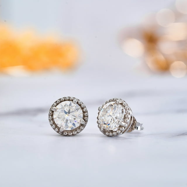 3.25 Carat Round Brilliant Moissanite Earrings Stud Halo Milgrain in 18K White Gold over Silver