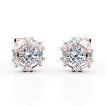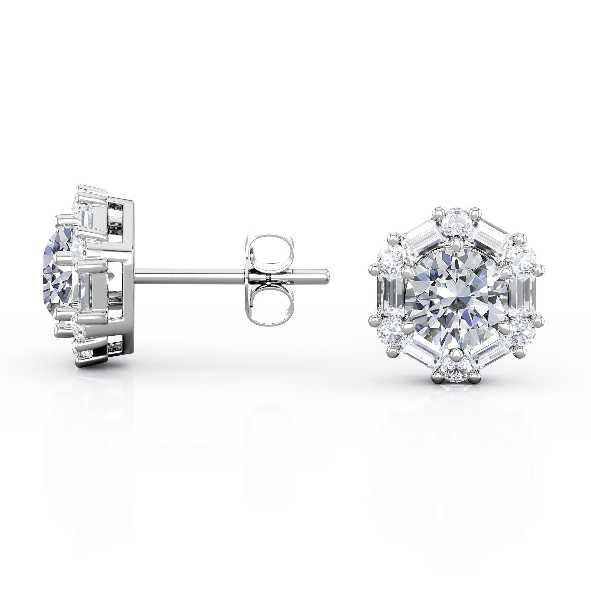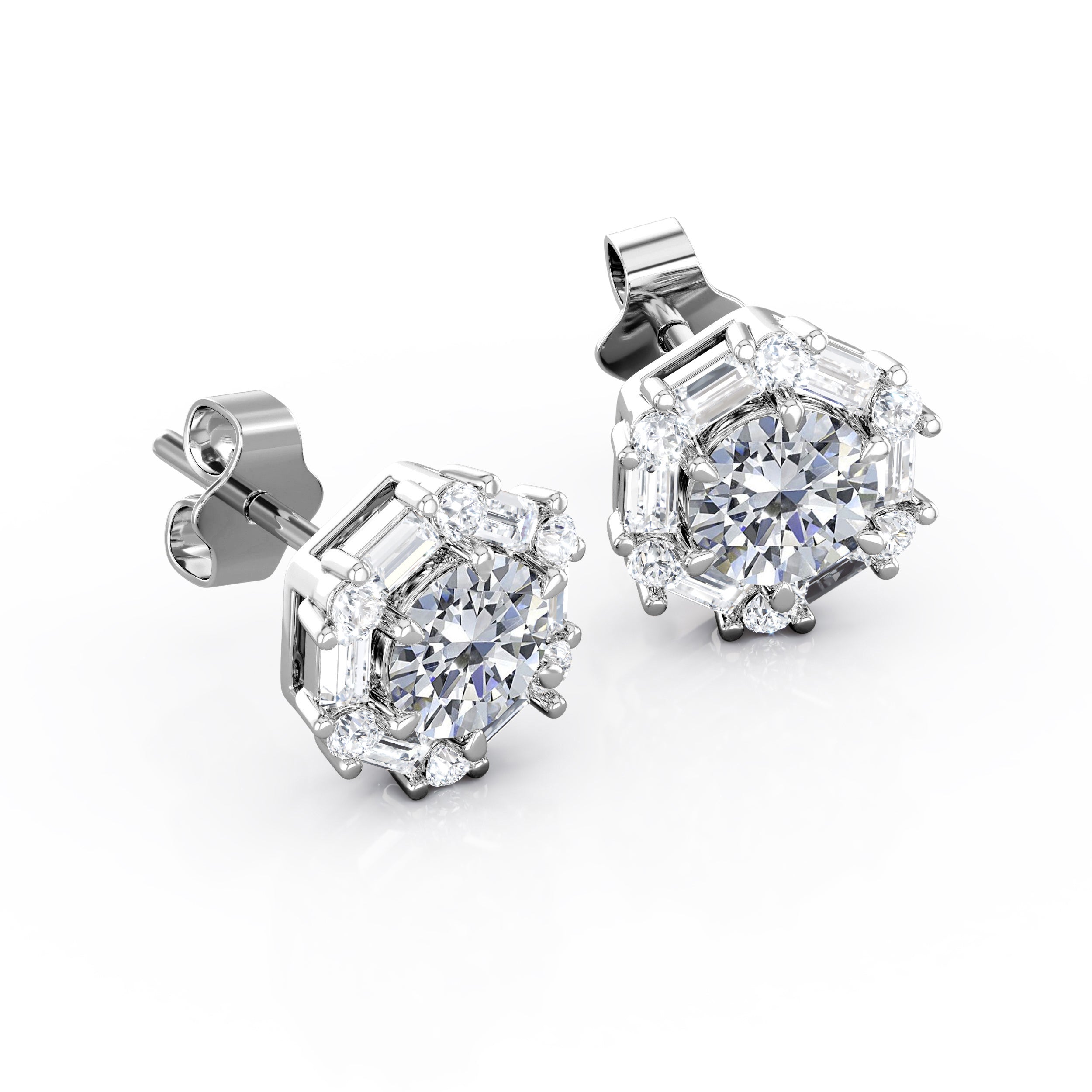 6 Prong 1.25 Carat Round Certified Moissanite and Diamond Hexagonal Halo Stud Earrings in White Gold
