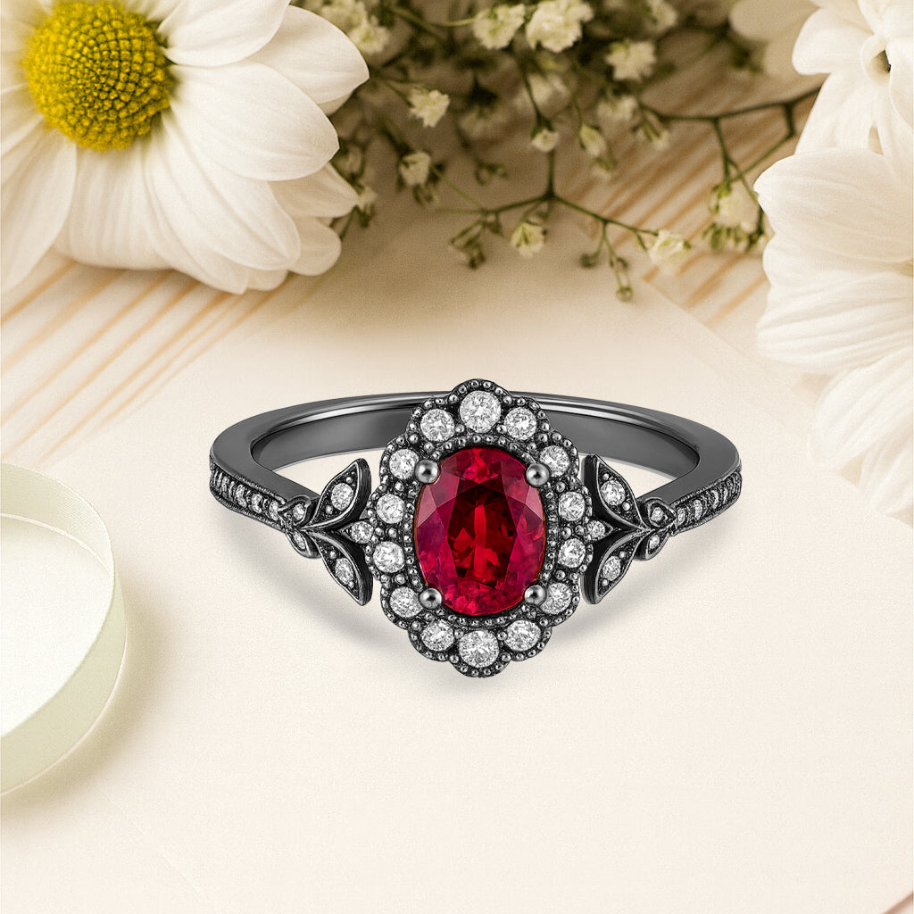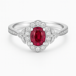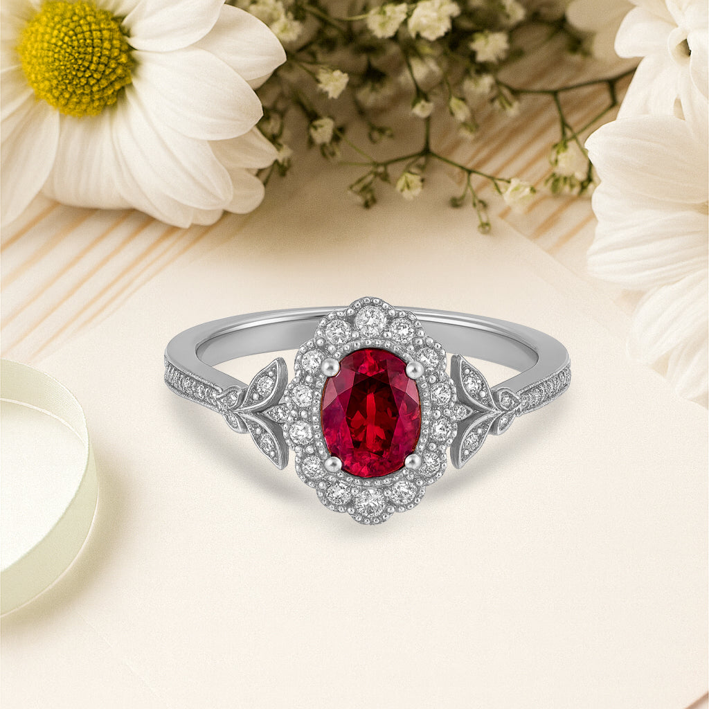 This vintage-inspired halo ring showcases a 1 carat oval-cut Lab ruby at its heart, embraced by 0.20 carats of sparkling side stones. When crafted in sterling silver, the accents shine with fiery moissanite brilliance, while in solid gold they are set with diamonds for timeless elegance. A perfect blend of romance and refinement, this ring is designed to be treasured for a lifetime. Its intricate details and radiant design make it a striking choice for engagements, anniversaries, or as a statement piece that will always turn heads.