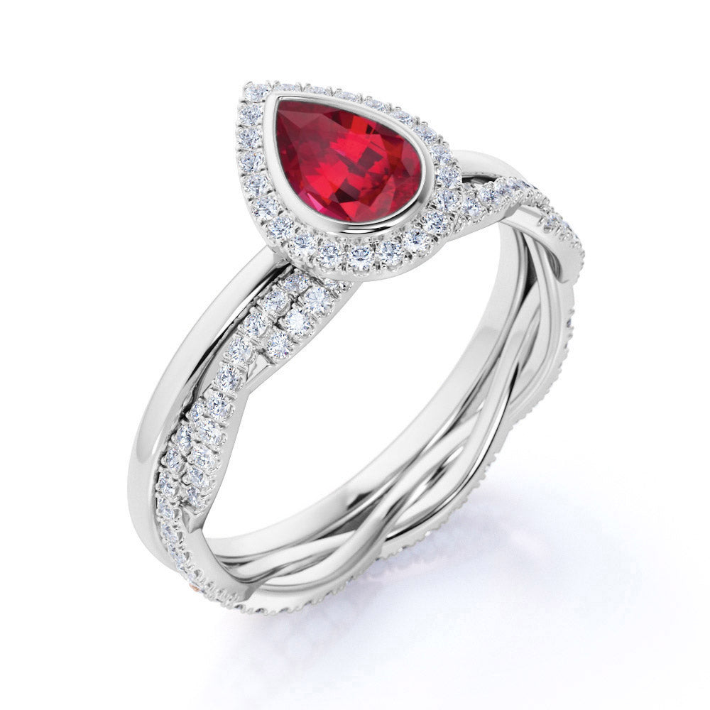 This is a classic infinity inspired 1.50 Carat Pear Shape Lab Ruby and Diamond Halo Wedding Ring Set in White Gold for women. Handmade and customized to perfection, this pave infinity bridal set ring is made with Lab Ruby, diamonds and gold. As always, the order comes with jewelry certificate, 6 month limited warranty and 30 days full refund policy. Although each ring is handmade and customized to your specifications, we guarantee that once you placed your order, we will make and deliver it to you within 5 business days.