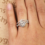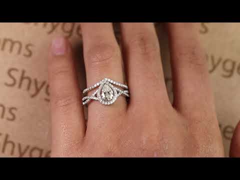 An exquisite style 1.75 Carat Pear Cut Real Moissanite Bridal Set in 18k White Gold Over Silver. The art deco and halo design engagement ring is made with natural and real moissanite, high quality zirconium, and 18k gold plating over silver. To accompany your vows, a matching classic wedding band completes this beautiful look. This piece of jewelry is handmade, sporting quality craftsmanship that will last for years to come. As always, the order comes with 30 days full refund policy. The beautiful moissanite ring also comes in a very beautiful jewelry ring pouch.