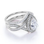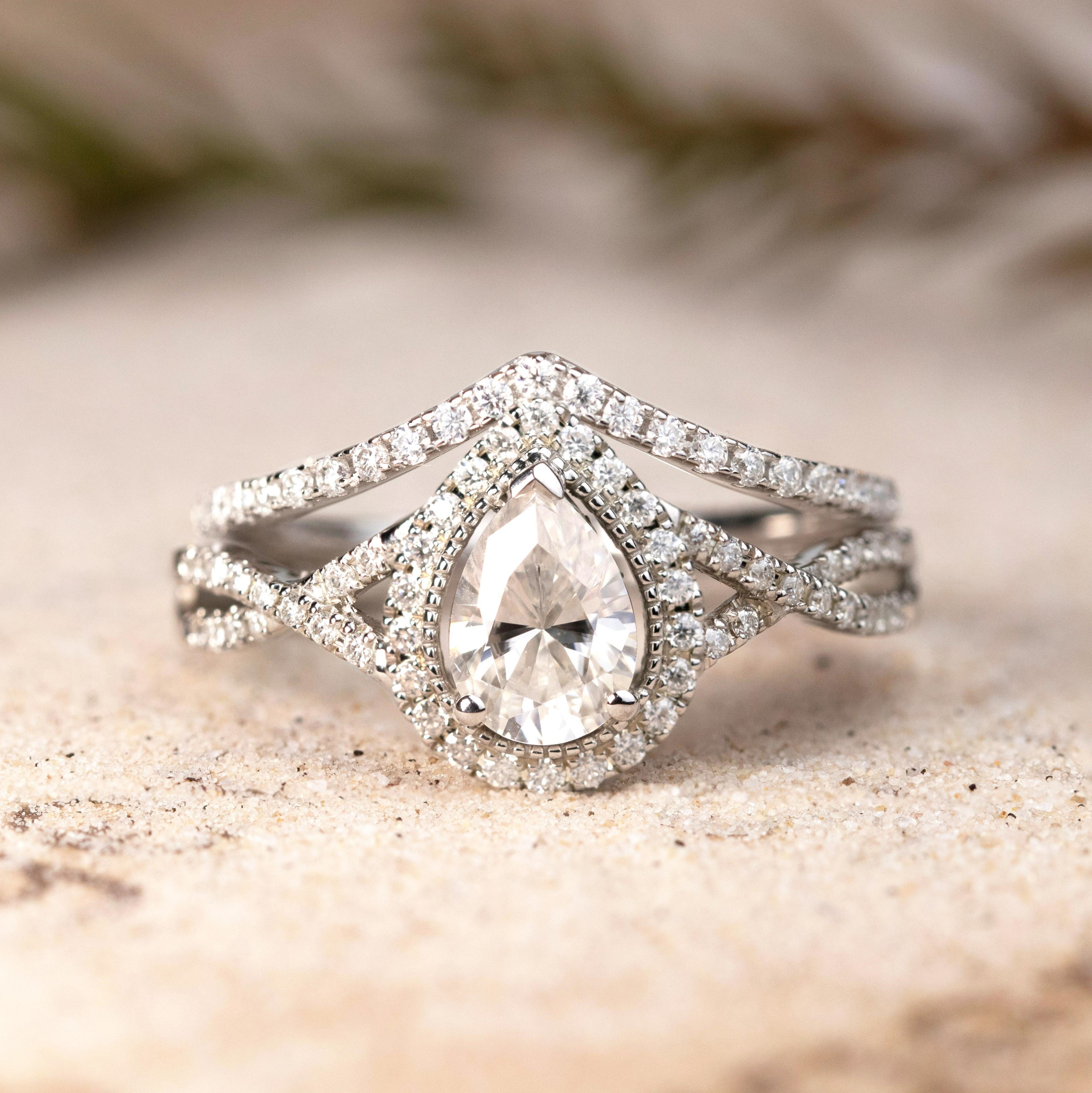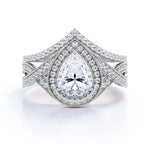 1.75 Carat Pear Cut Moissanite Wedding Set - Bridal Set - Art Deco Ring - Halo Ring - Cluster Ring - 18k White Gold Over Silver