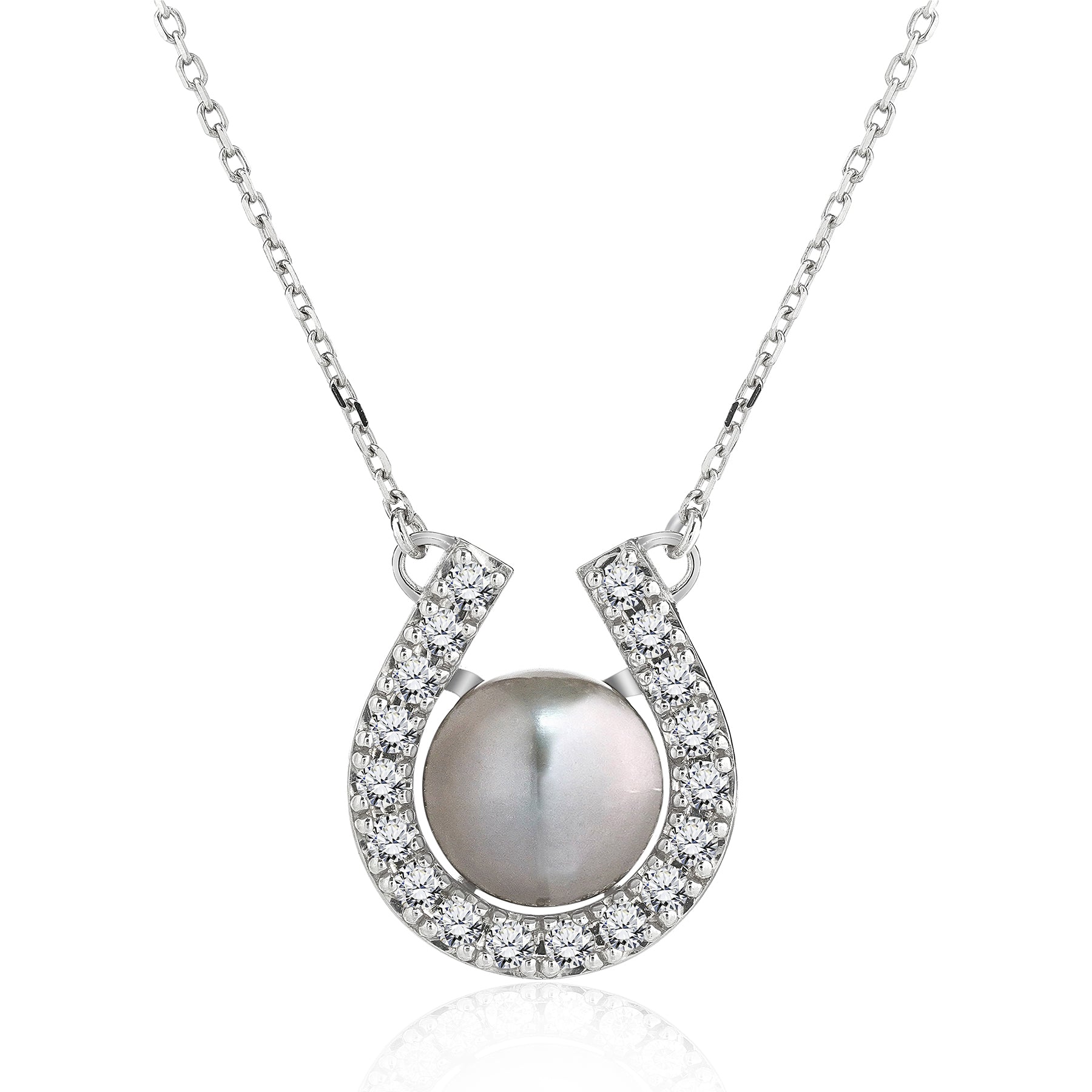 8mm Grey Pearl Necklace Moissanite Horseshoe Pendant in 18K White Gold over Silver