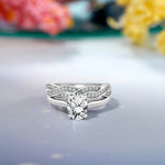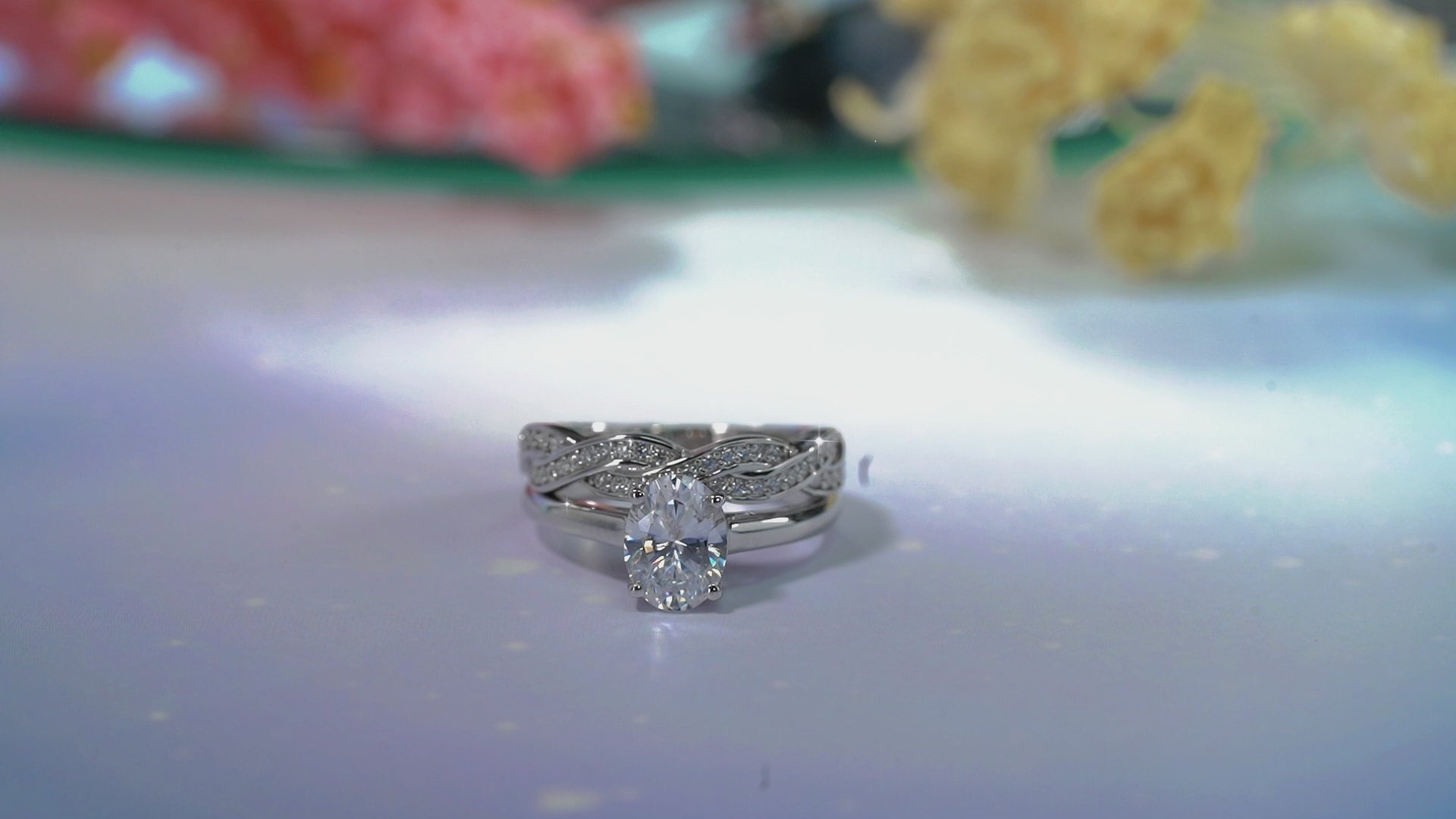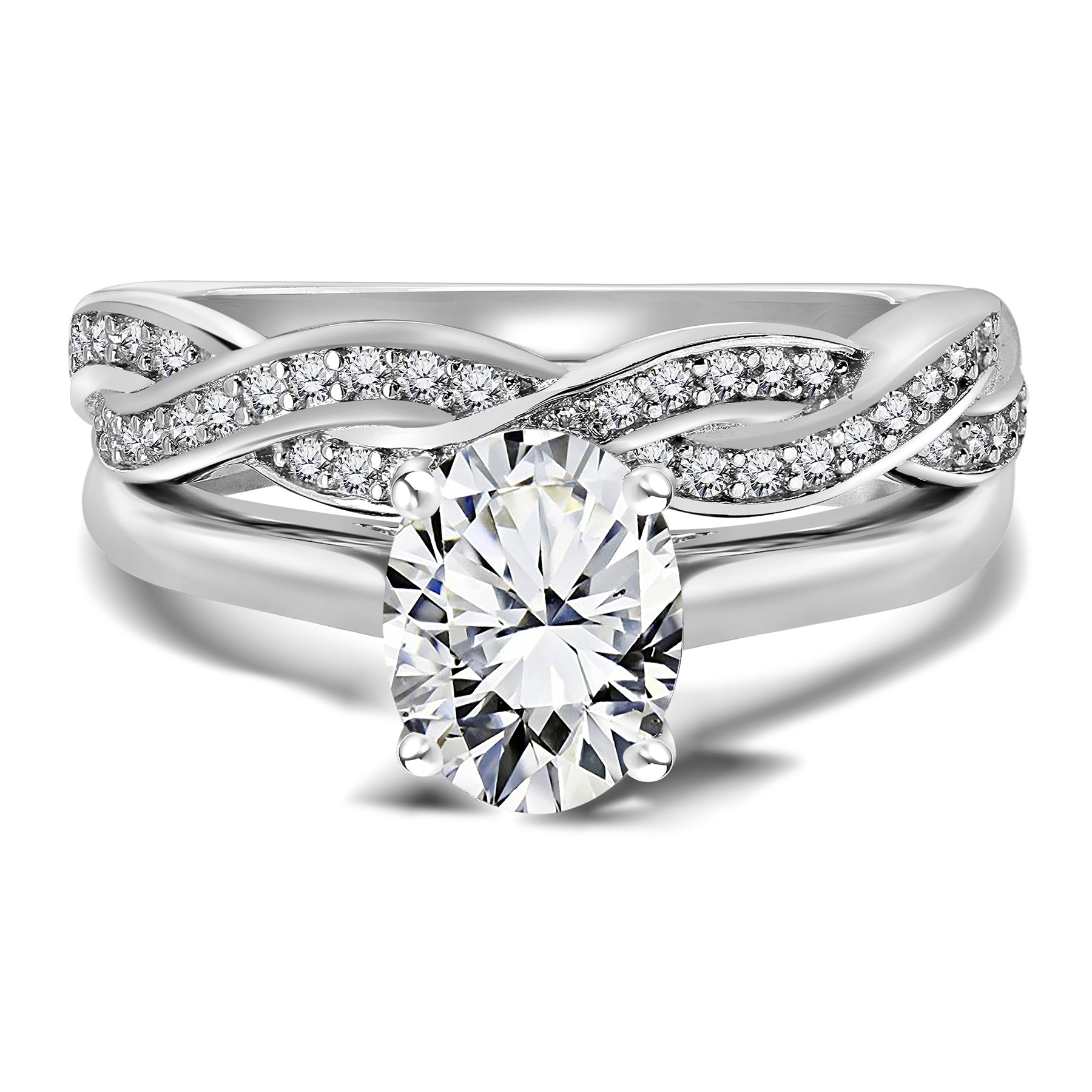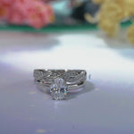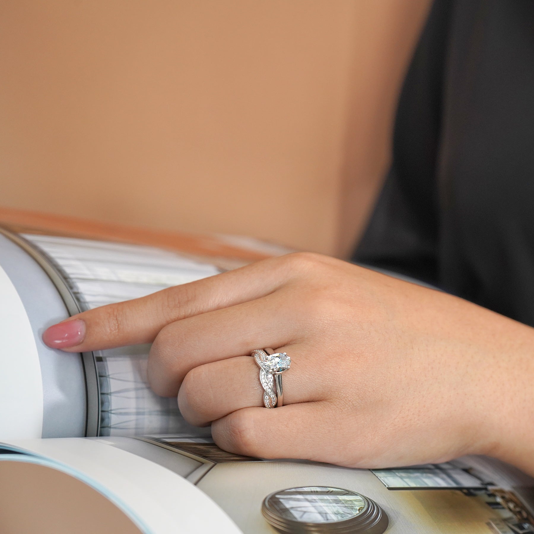 Take a look at our Brilliant 1.75 Carat Oval cut Moissanite Engagement Ring and Infinity Wedding Band Set in 18K White Gold over Silver. These spectacular Moissanite wedding sets set include a 1.50 carat classic oval cut engagement ring and a 0.25 carat stylish infinity wedding band. If you are looking for a 2 carat oval engagement ring set, this is the one of the best and closest ring sets you can get at this incredible price. The silver oval engagement ring, being the main ring of the set, is a classic solitaire ring style that goes with any of your outfit and suitable for every occasion. Additionally, the beauty is further enhanced with our specially designed intertwined ring. Worn together, this white gold Moissanite wedding set over 925 sterling silver is sure to bring out the inner beauty and the biggest smiles to your loved one's faces. These sterling silver Moissanite bridal sets are extremely versatile and are sure to last for a long time as they are made from high-quality Moissanite stones and sterling silver. Surprise your loved ones with our Brilliant 1.75 Carat Oval Engagement Ring and Infinity Wedding Band Set in 18K White Gold over Silver.