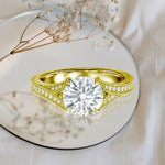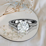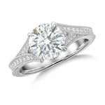 This Certified Lab Diamond elegant vintage-inspired ring carries a total carat weight of 1.10 Ct, blending classic beauty with refined detail. At its center sparkles a 1 carat round cut lab grown diamond, radiating brilliance and sophistication. The side stones, line the split band with milgrain accents, and the side stones will be Moissanite. With its timeless design and graceful craftsmanship, This Certified Lab Diamond engagement ring is a symbol of romance and everlasting love.
