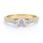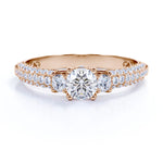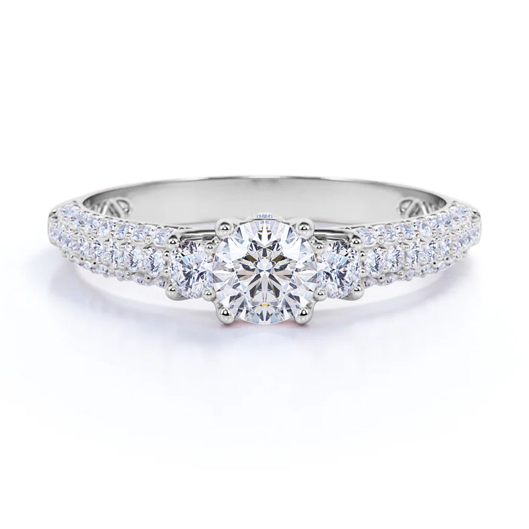 This Certified 1 Carat Round Cut Lab Grown Diamond Classic Three Stones Engagement Ring - Vintage Style Micro Pave Wedding Ring is the better way to profess and symbolize your undying affection. Make your finger sparkle with this stunning Diamond Engagement, Anniversary, or Promise ring for women. This Diamond ring is also designed to complement the finger of a beloved spouse whether to celebrate an engagement or anniversary mark an important milestone. This vintage Diamond engagement or promise ring is very well-suited for those who have a penchant for vintage and antique pieces. You can mix and match this vintage-inspired ring with your other jewelry accessories. This antique-style Diamond ring for women will surely complement any style you sport. It is embellished with a stunning total of 1 carat genuine Diamond center stones. Its beauty is further accentuated by a delicate medley of glimmering moissanite side stones. Make a loved one feel special or simply treat yourself with this very low priced but genuine diamond ring that can be cherished for years to come.