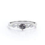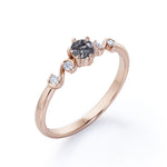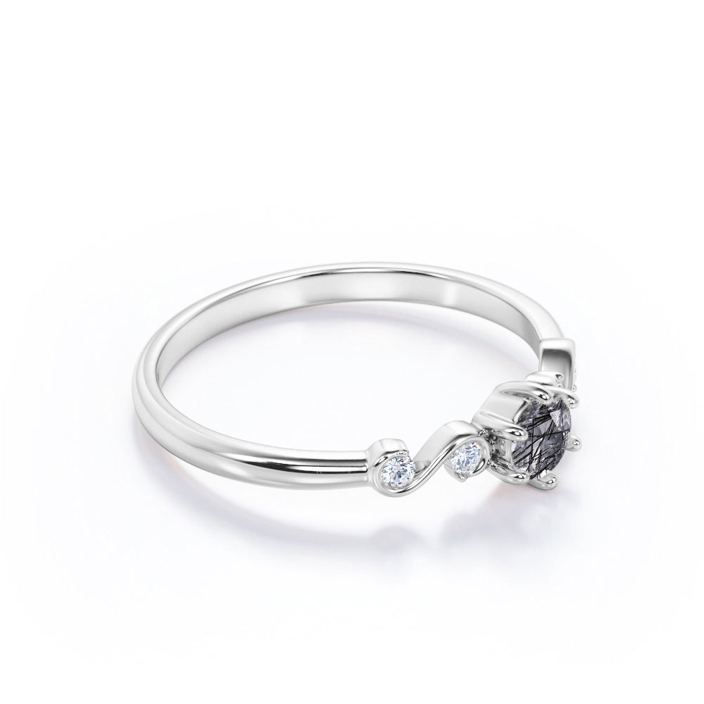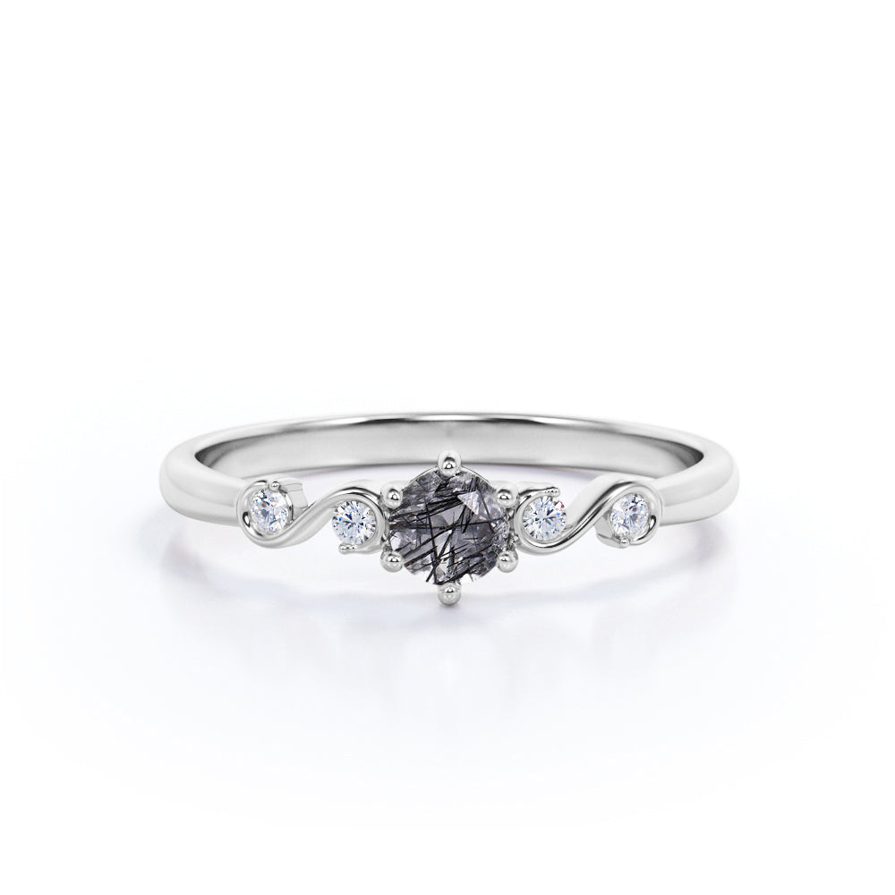 Dainty 6 Prong 0.60 Carat Round Cut Black Hair Dendritic Rutilated Quartz and Diamond Twist Engagement Ring