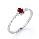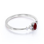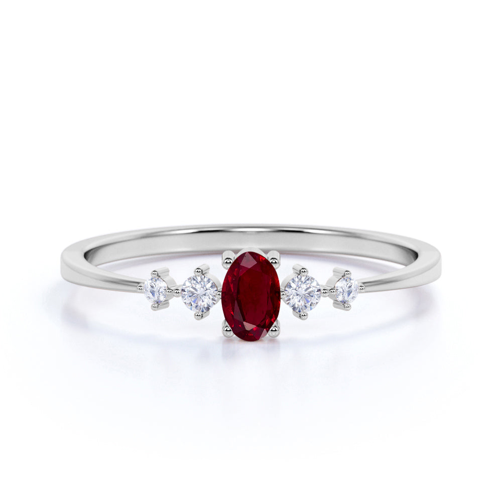 Dainty Oval Shape Ruby and 5 Stone Diamond Tapered Shank Engagement Ring in White Gold