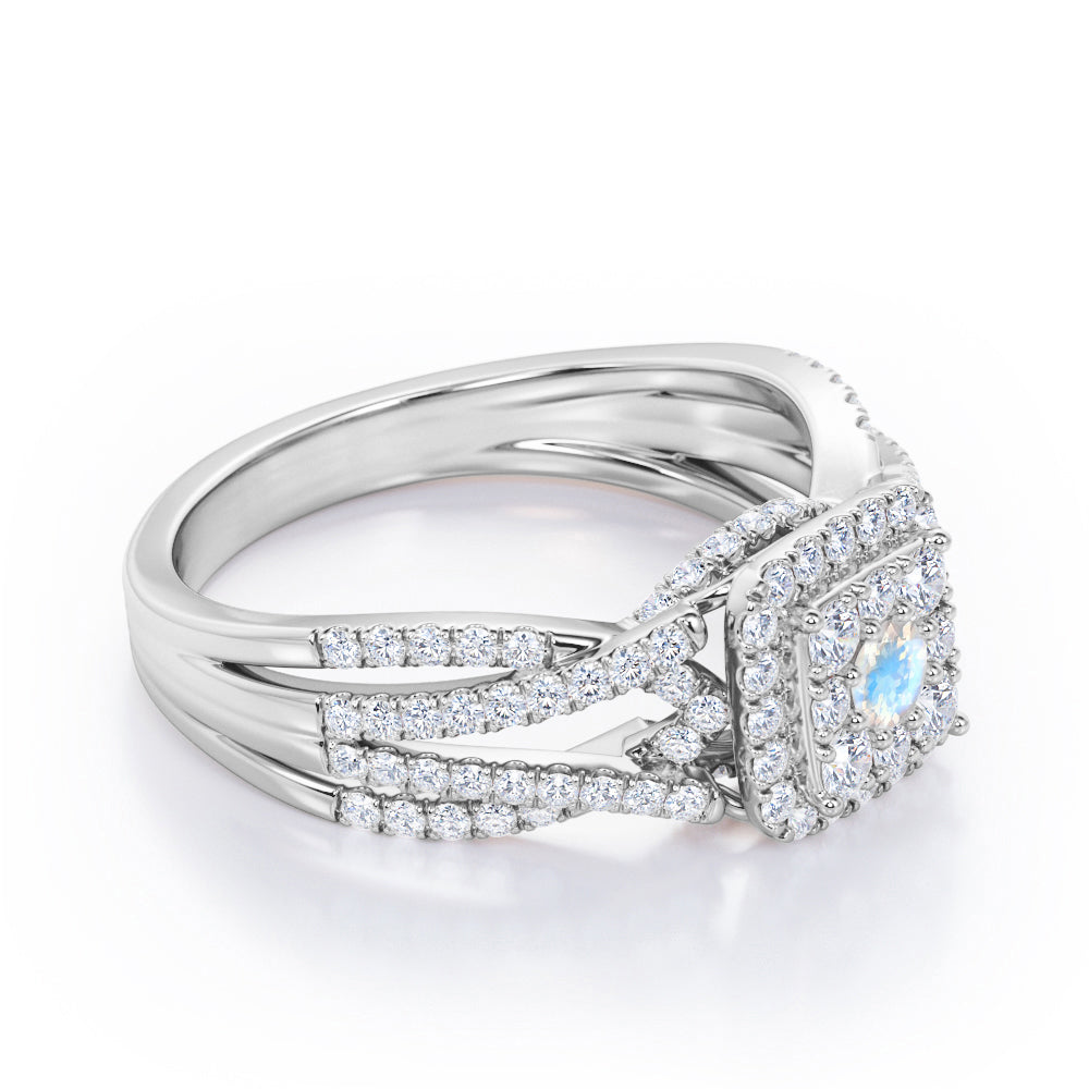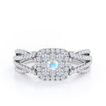 Double Infinity Split Shank - 1.4 Carat Round Shaped Moonstone and diamond - Flush Cluster Halo Engagement Ring in White Gold