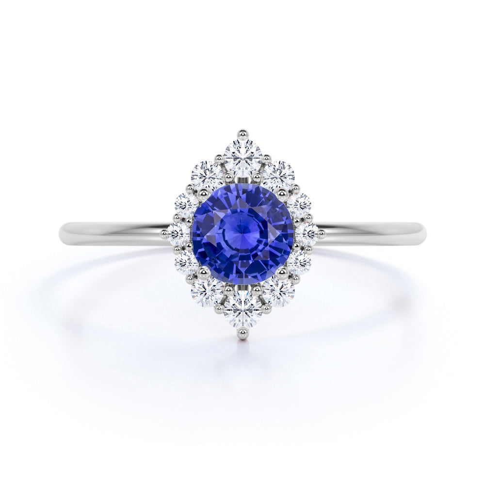Elegant 0.75 Carat Round Dark Blue Sapphire and Diamond Halo Dainty Engagement Ring in White Gold