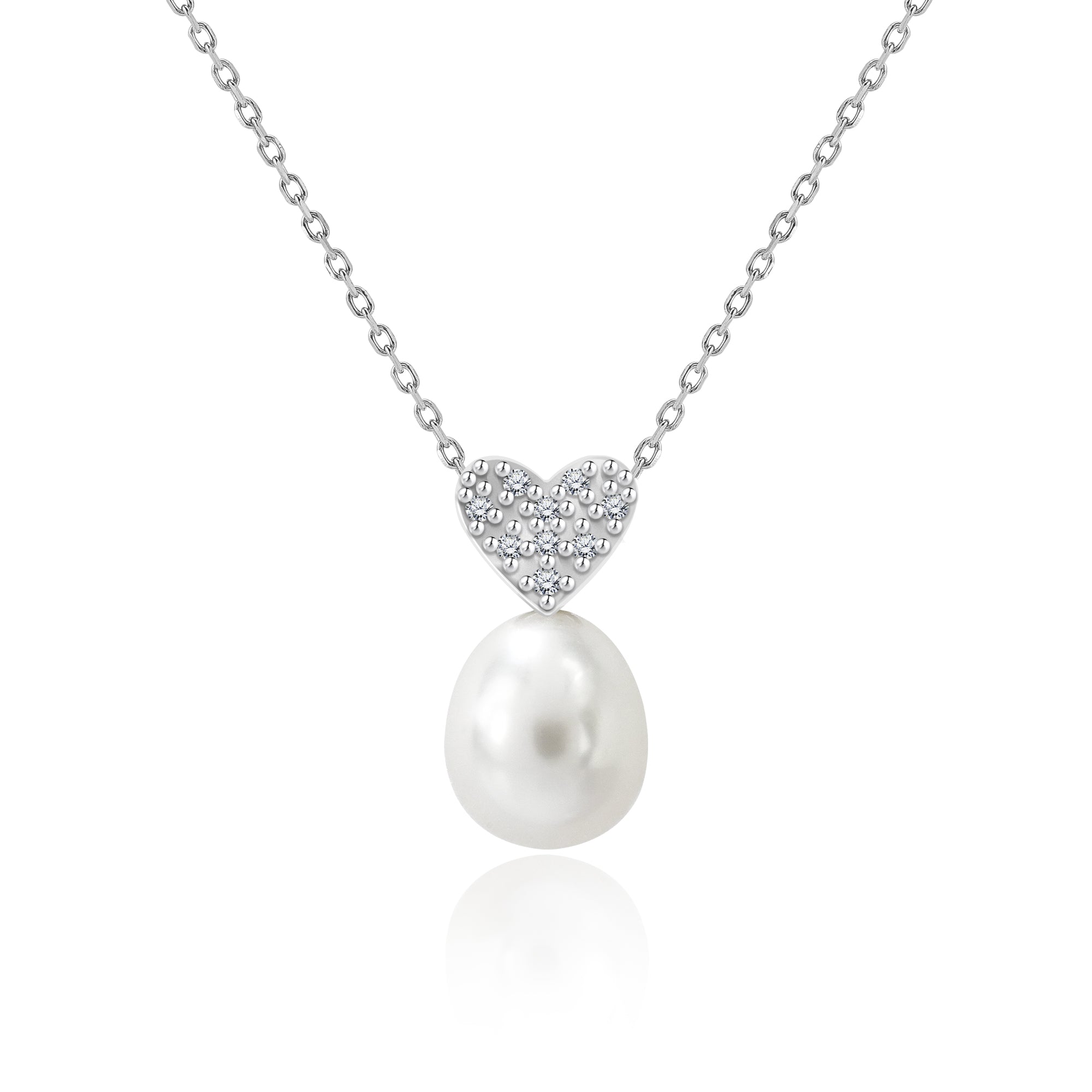 Step into a world of enchantment with our Enchanting White Pearl Necklace Pendant with Moissanite Heart Milgrain in 18K White Gold over Silver. This exquisite pendant effortlessly combines elegance, durability, and affordability, making it an irresistible choice for any occasion. At the heart of this captivating piece lies a radiant 8mm pearl and a heart milgrain piece decorated by moissanite totaling to a total carat weight of 0.04 carat on top. The teardrop pearl pendant necklace's every intricate details complement each other to enhance its irresistible allure. The heart and pearl necklace is as unique and enchanting due to its two main components: the illuminating white pearl and the moissanite heart-shaped accent which adds a sparkling touch of romance. Crafted with professional artistry and offered at this price, this pearl charm for necklace is the ultimate compromise between elegance and affordability. Embrace the versatility of this women's pearl pendant necklace, suitable for every woman in every moment. Whether it's a formal event, a romantic evening, or a casual gathering, this cultured pearl jewelry piece is a symbol of timeless elegance that effortlessly brings your inner beauty out. Discover the enchantment of this single pearl necklace, our veery own Enchanting White Pearl Necklace Pendant with Moissanite Heart Milgrain. Pearl Size: 8 MM|Pearl Color: White|Secondary Gemstone: Moissanite|Total Carat Weight: 0.04 Carat|Gemstone Color: Near Colorless|Gemstone Clarity: VS|Metal Type: 18K White Gold Plating over Sterling Silver|Manufacturer: JeenMata