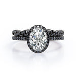 Four-Prong Halo 1.75 TCW Oval-Shaped Moissanite with Lab Created Black Diamond Pave Twisted Eternity Bridal Set in White Gold