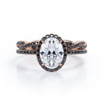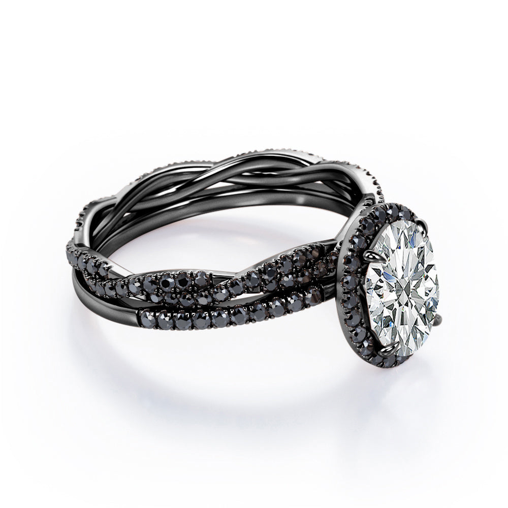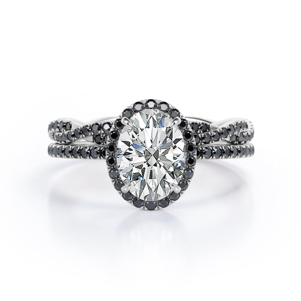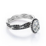 Start the greatest love story of your life with this Four-Prong Halo 1.75 TCW Oval-Shaped Moissanite with Lab Created Black Diamond Pave Twisted Eternity Bridal Set in White gold. Skillfully hand-cut into a nice oval cut by our skilled jewelers, this exceptional best moissanite engagement rings set consists of total 1.75 carat moissanite and lab-created black diamonds. Special and non-traditional, this moissanite promise ring set is perfect for those who would love to express their charisma and uniqueness. With naked eyes moissanites look, shine and feel exactly like diamonds. Reflective properties of this moissanite ring set will enhance happiness and attract positive vibes. This moissanite jewelry is beautiful and accessible since it is available at an affordable price. Moissanites are the most popular alternative gemstone for diamonds while being at lower and more affordable price. Considered as a symbol of timeless love and affection for your lover, this best moissanite engagement rings set can be a perfect gift for any occasion like engagements, Valentine's day, mother's day or anniversary. This best moissanite ring set can be customized, so customers can choose one of metal colors between White gold, rose gold, yellow gold and black gold in 18k Gold over Silver, 10k and 14k gold metal options. In regards to its hardness, moissanite is almost as hard as diamond which means that it is notably durable. Letâs impress her with this sterling silver moissanite wedding rings set and, surely, she will not regret it.