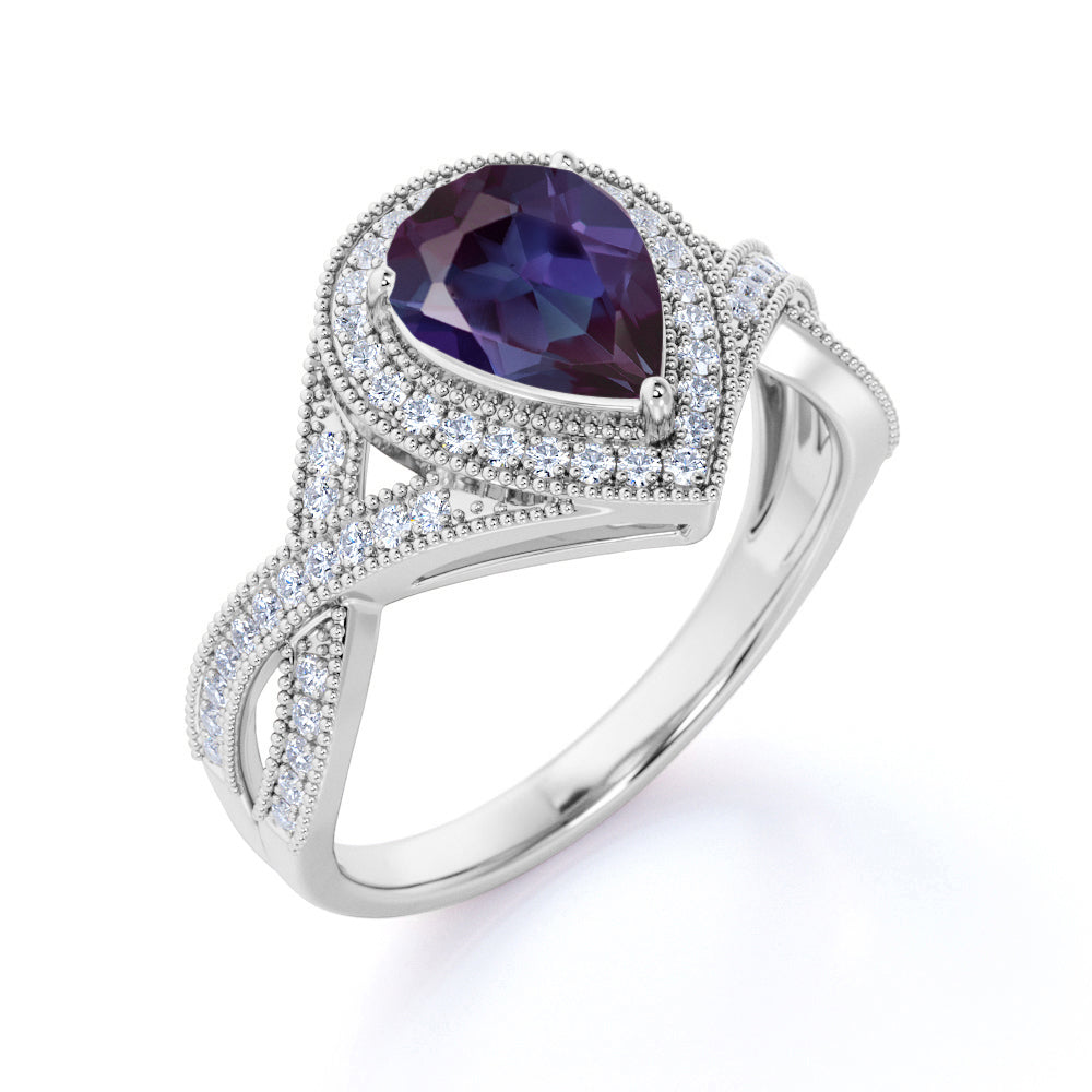 Be on cloud nine with this Infinity Art Nouveau 1.50 Carat Pear Cut Lab Alexandrite and Diamond Halo Milgrain Statement Ring - Engagement Ring. This crossover style ring features 1 carat pear cut lab grown Alexandrite and .50 carat real genuine side diamond for gold ring and moissanite for silver ring. This classic engagement ring can be customized to either 10k, 14K and Gold over Silver and either Black Gold, Rose Gold, White Gold or Yellow Gold. Also, as your satisfaction is our most priority, we will do our best to have your handmade jewelry be carefully and beautifully crafted by our expert jewelers. The order also comes with a 30-day full refund policy. Crowned as June birthstone, this flawless synthetic Alexandrite ring will bring hope as well as encouragement to you. Being one of the rarest gemstones in the world, this ring will create a charming and fascinating look on your fingers. This fascinating ring is a perfect match for those who are looking for symbol of luck, hope and good fortune. If you are searching for some alternate gemstone, this Friday's stone ring will be your right choice. This simulated Alexandrite ring gives a vivid grass green color in daylight and displays an intense raspberry red in candescent light. Create a fascinating look on your finger with this lab created Alexandrite ring for women which is available in both solid gold and sterling silver. This ring will surely complement every style of its wearer. This engagement ring will create a timeless and fabulous look on your finger. Sparkle your finger with this mystic lab made Alexandrite ring which is perfect for any occasion and everyday wear. It is the perfect match for those who are looking for a remarkable gemstone rings as Alexandrite embodies their own unique color-change ability and uplifting meaning.