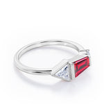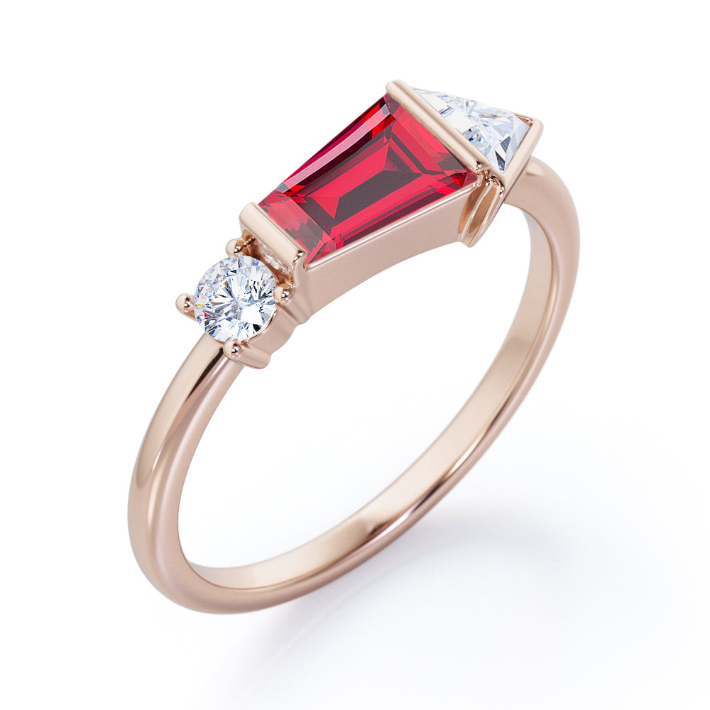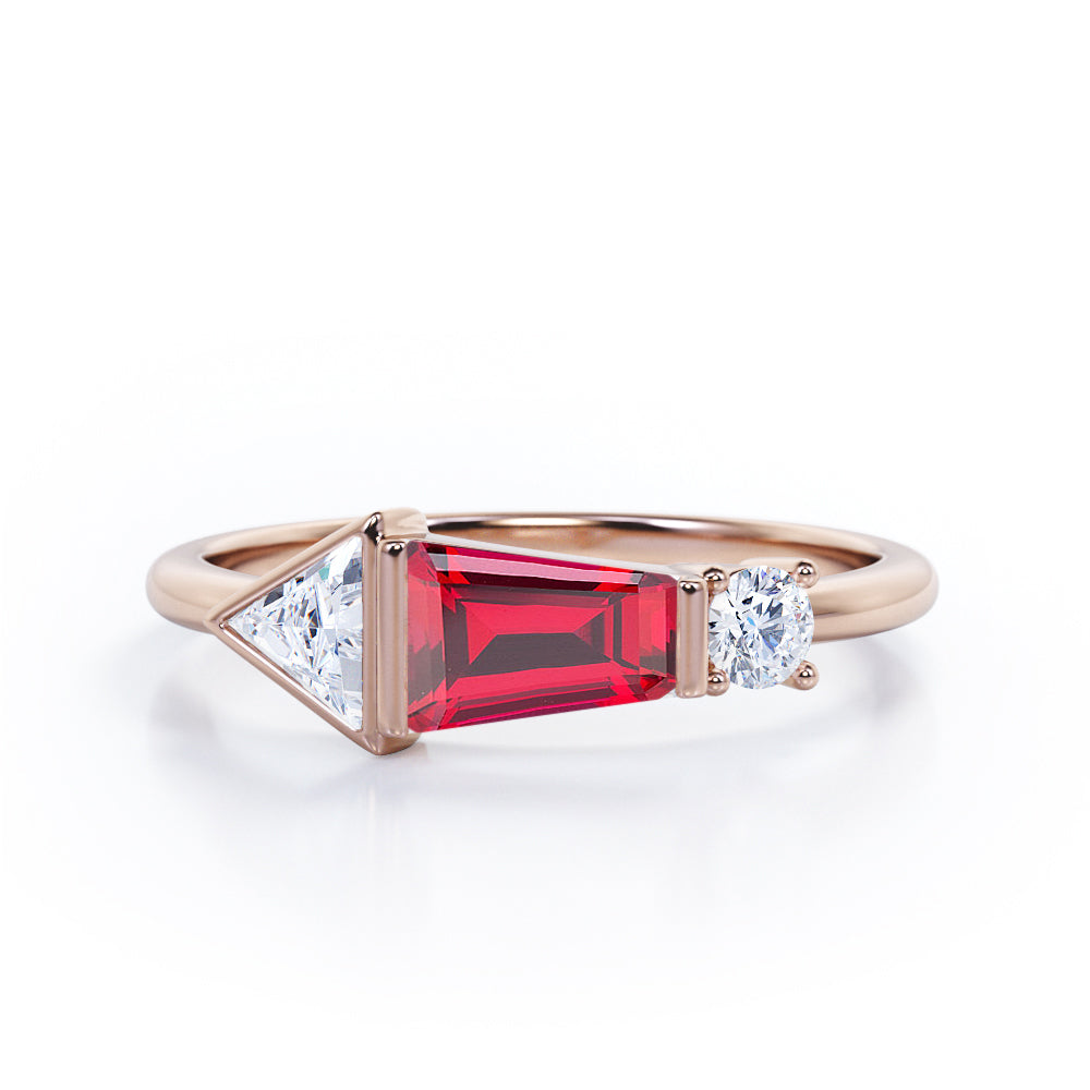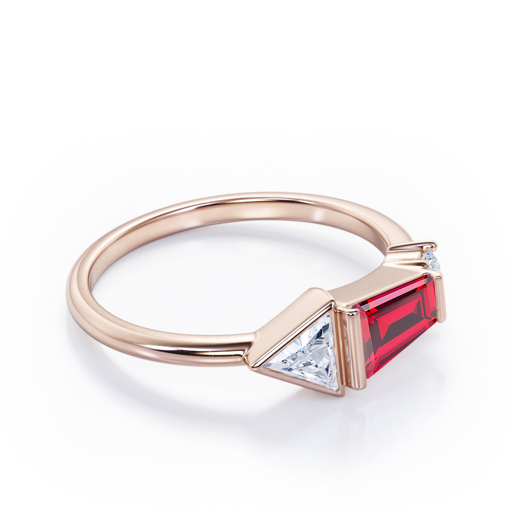 Lovely House Three Stone 1 carat Baguette Lab Ruby and moissanite Engagement Ring in Rose Gold