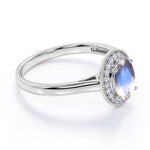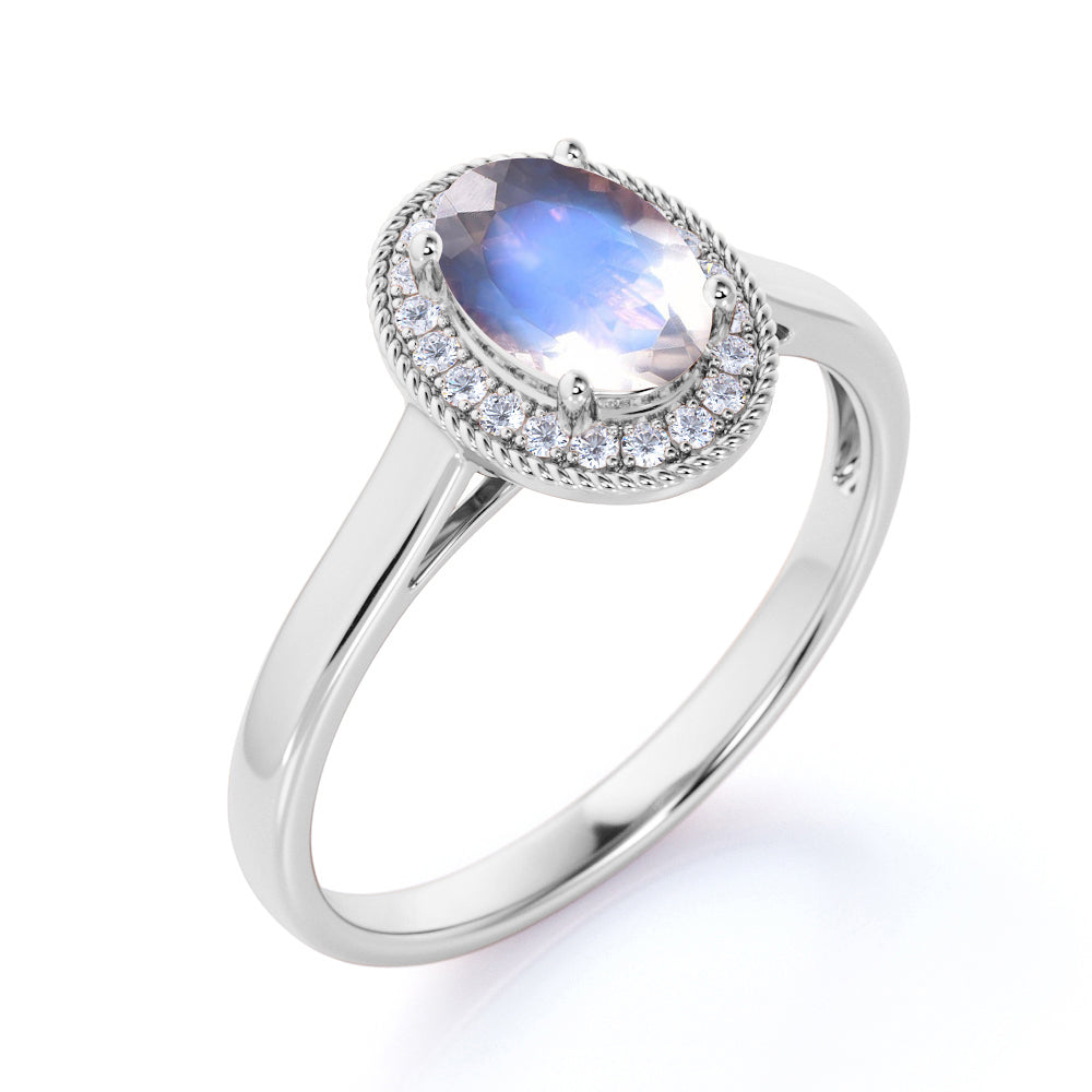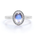This petite moonstone ring is very cool and comfortable, it is also great for daily wear or even a proposal ring for her. If you don't want a modern moonstone ring, this classic moonstone ring is the best for you. It reminisce your past and those times when you and her are still young lovers. This moonstone ring features an approximately 1 carat oval shaped certified moonstone, surrounded by .25 carat authentic diamond accent for gold ring and moissanite for silver ring, for a total weight of 1.25 carats.