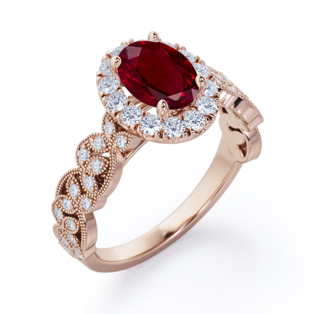 Feature a vintage ring on your hand with style. A Milgrain Leaf 0.9 carat Oval Lab Ruby and Diamonds Nature-Inspired Engagement Ring in Rose Gold is full of intricate design. It can be a perfect choice for a proposal ring, anniversary ring or a special gift in a special event. The ring features a 0.5 carat Oval Lab Ruby with round diamonds as the halo and the band showcases a floral pattern; round petite diamonds is placed inside marquise shape that is bordered by Milgrain. Each petal is placed in different angles and formed into a vintage flowers. The promise ring can be made in 18k gold over silver, 10k gold and 14k gold with the color of white gold, rose gold, yellow gold and black gold.