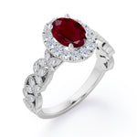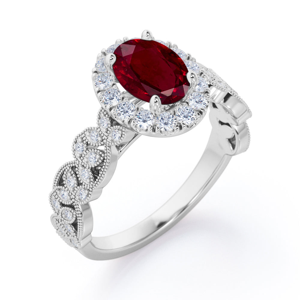 Milgrain Leaf 0.9 carat Oval Lab Ruby and Diamonds Nature-Inspired Engagement Ring in White Gold