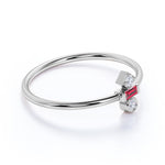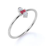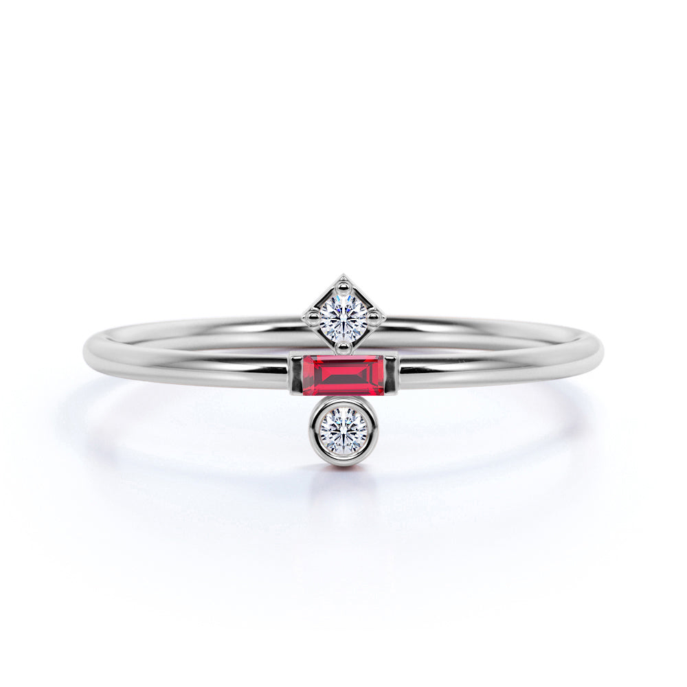 Minimal Baguette Shape Lab Ruby and 3 Stone Diamond Engagement Ring in White Gold