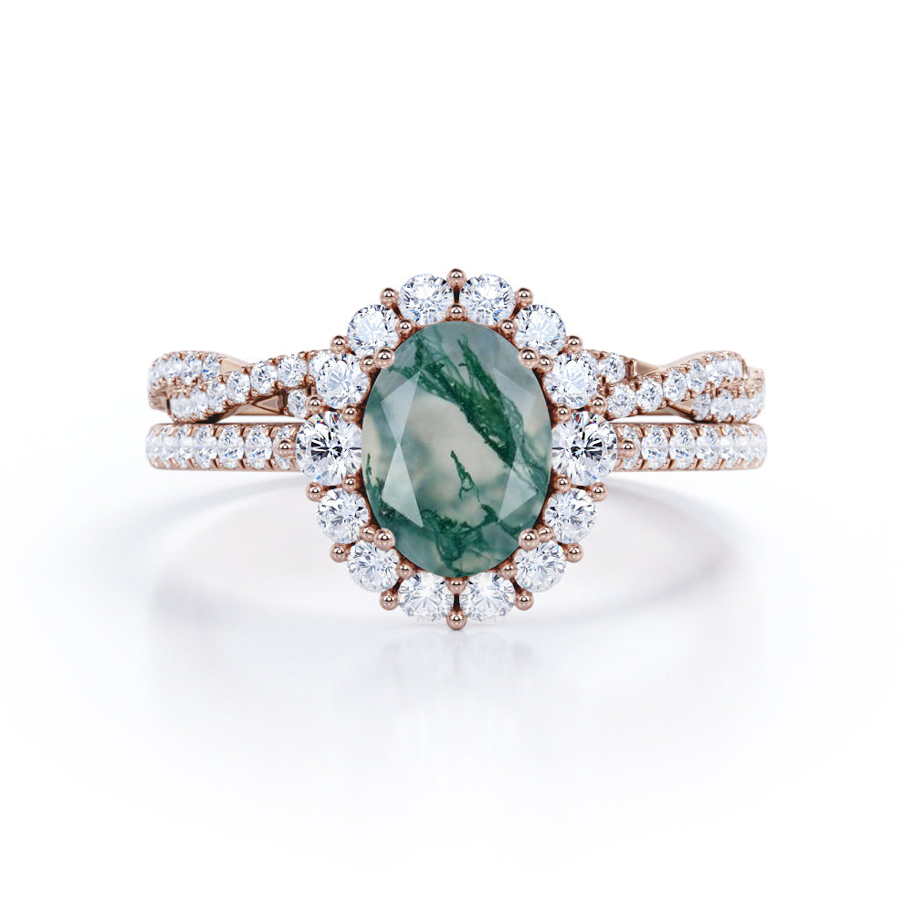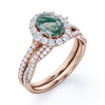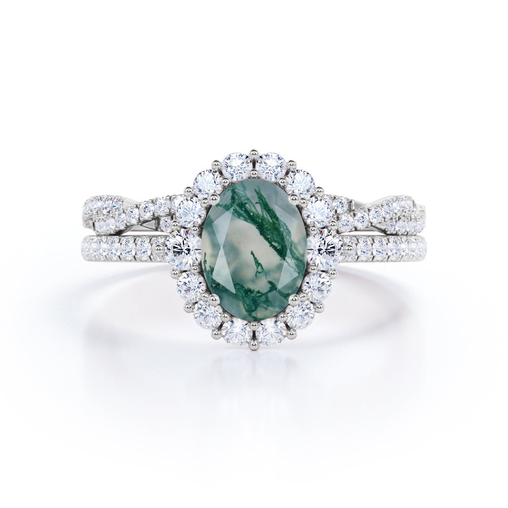 Clustered Oval 1.25 Carat Moss Agate Wedding Ring Set