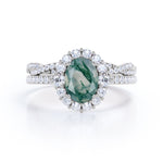 Impress her with this Oval 1.25 carat Moss Agate and Moissanite Reminiscent Wedding Ring Set in White Gold For Her. The classic solitaire engagement ring displays a 0.5 carat beautiful Moss agate and 0.75 carat Moissanite. Natural oval Moss agate is secured in 4 prongs and surrounded by round petite Moissanite, the halo possesses dainty Moissanite in shared prongs and it creates the appearance of small flower. Moissanite cascades down the shoulder of the band and continue to half of the band. Half infinity wedding band also has lined brilliant round Moissanite that accents the glitter of halo promise ring. The bridal set can be customized into white gold, rose gold, yellow gold and black gold. We offer 4 options of metal that will fit your budget; 18k gold over silver, 10k gold, 14k gold and 18k gold.