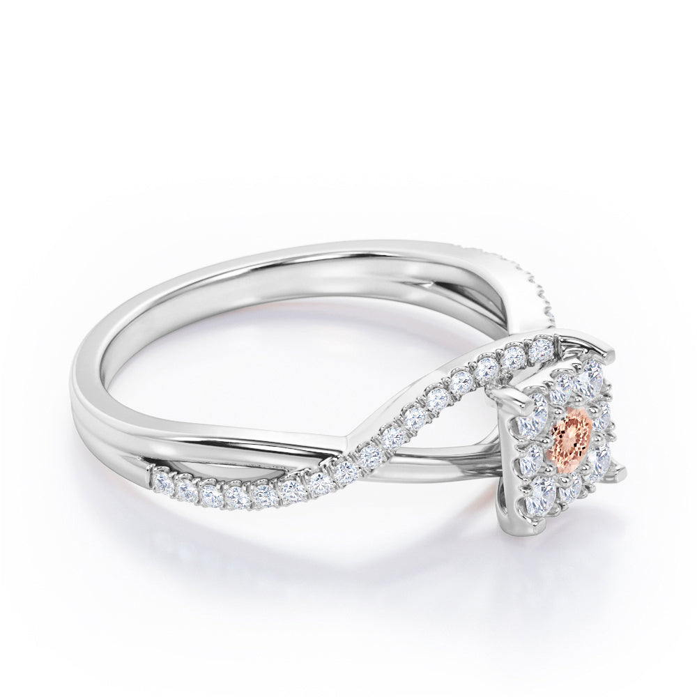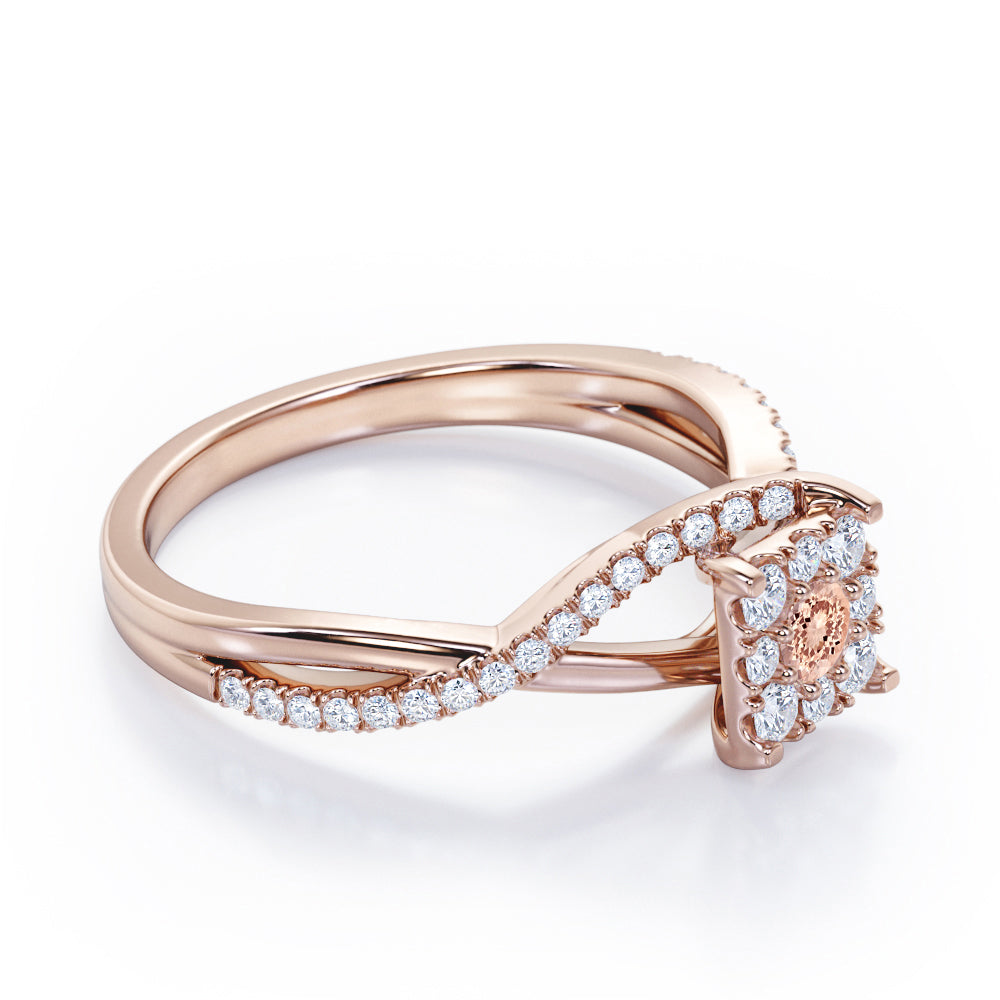 With this Semi Twisted Infinity 0.9 Carat Round Shape Morganite and diamond Square Floral Cluster in Rose Gold, you can begin the most romantic chapter of your life. Handcrafted with care into a wonderful round cut by our lapidary expertise, this gorgeous Morganite engagement ring showcases a natural 0.5 carat Morganite stone in the center with 0.4 carat diamond side stones for a total carat weight of 0.9 carat. For those looking for something a little out of the ordinary, this engagement ring for women is an excellent choice. This cheap Morganite engagement ring will bring joy and good energy to its wearer. Beautiful and affordable, this gem engagement ring is stunning and inexpensive, thanks to its reasonable price. This affordable engagement ring for women, the birthstone ring for November, symbolically represents love and dedication, is the best gift you can give to your significant other. Also, this Morganite ring can be customized, so customers can choose one of metal colors between white gold, rose gold, yellow gold, and black gold. Let's show her how much you care by giving her this Morganite engagement ring, and she will never regret it.
