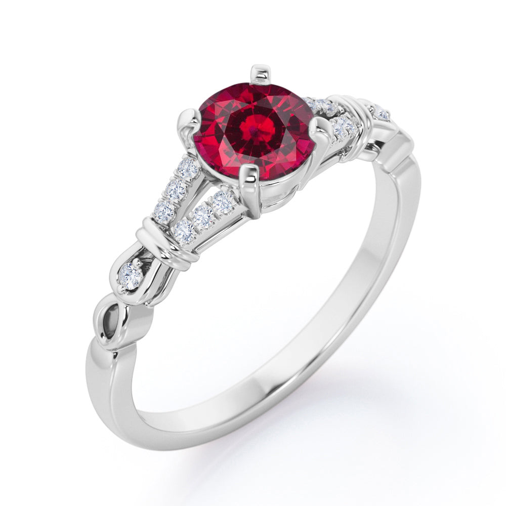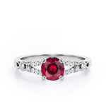 Either it's a special occasion or just an ordinary, ring is always something you can get for all women. The Split Shank 0.6 carat Round Lab Ruby and Diamond Engagement Ring in Rose Gold features a 0.5 carat Round diamonds on Y-shaped band, illustrating a tied rope with double knot. The band is garnished by dainty round diamonds with 7 stones on each side. The ring can be customized to your choice of 18k gold over silver, 10k gold and 14k gold with the color of white gold, rose gold, yellow gold and black gold.