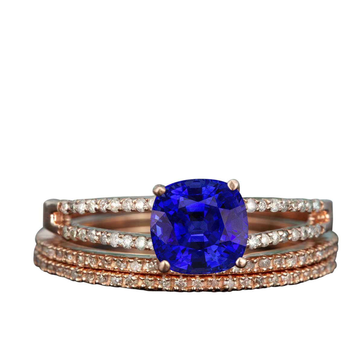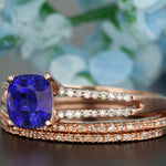 Stunning 2 Carat Cushion Cut Natural Sapphire and Moissanite Wedding Trio Ring Set with Engagement Ring and 2 Wedding Bands in 18k Gold Over Silver