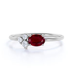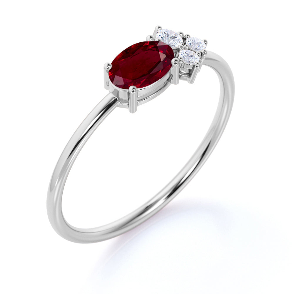 Tiny Asymmetric Oval Ruby and 4 Stone Diamond Vintage Engagement Ring in White Gold
