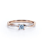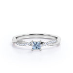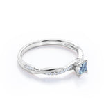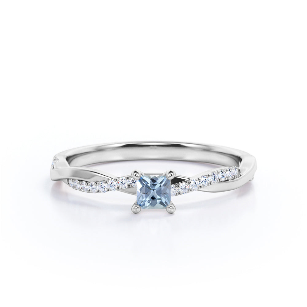 Twisted 1.10 Carat Princess Cut Aquamarine And Diamond Infinity Engagement Ring In White Gold. A simple piece that will surely put a smile on her face. Infinity rings have always been known to be a symbol of your undying love and affection for each other which makes this engagement ring a perfect option for you. The center stone features the prong setting that securely holds the very fine blue aquamarine stone in place while paved diamonds surround half of the twisted band adding brilliance to the ring. Handcrafted with passion, this semi-eternity promise ring is made with 1 carat very fine blue princess-cut aquamarine center stone, surrounded by 0.10 carat dazzling diamond side stones for the gold rings and moissanite for the silver rings that weigh a total of 1.10 carat. Simply adorable in white gold, this twisted engagement ring is also available in rose gold, yellow gold, and black gold. Also, it can be made between 18k gold over silver, 10k gold, and 14k gold depending on your preferred customization. Please kindly note for the silver ring option that silver is a very sensitive metal, any chemicals like hand creams, lotion, or sanitizers. etc., can affect the plating.
