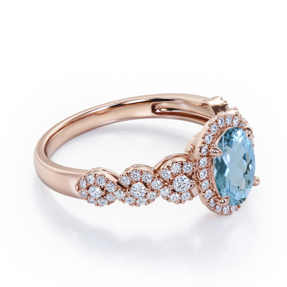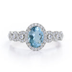 Twisted 1.45 Carat Oval Cut Aquamarine And Diamond Halo Engagement Ring In White Gold