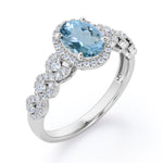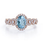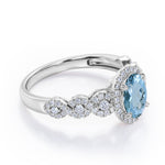 Twisted 1.45 Carat Oval Cut Aquamarine And Diamond Halo Engagement Ring In White Gold. Timeless and divine, this Aquamarine and diamond infinity ring is perfect for the minimalist bride who lean towards modern elegance. The center stone looks even more unique in an oval cut, surrounded by a halo of white dazzling diamonds. The twisted bands are set with pave diamonds that perfectly frame the oval shaped aquamarine at the center. This halo engagement ring features 1 carat aquamarine and 0.45 carat diamonds as the side stones. The four claws holds the center stone firmly at a place which exhibits great brilliance. This twisted 1.45 carat oval cut aquamarine and diamond halo engagement ring in white gold can also be customized to 18k Gold plating over silver, 10k Gold or 14k Gold as per your preference. Please note that if the ring is made over silver, the side stone will be moissanite and if it is made on gold, diamond will be employed as the side stone.